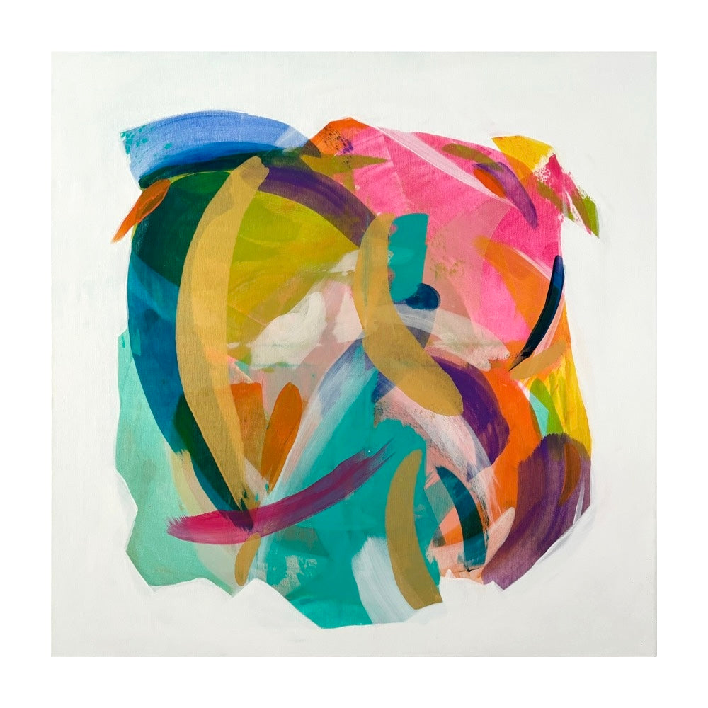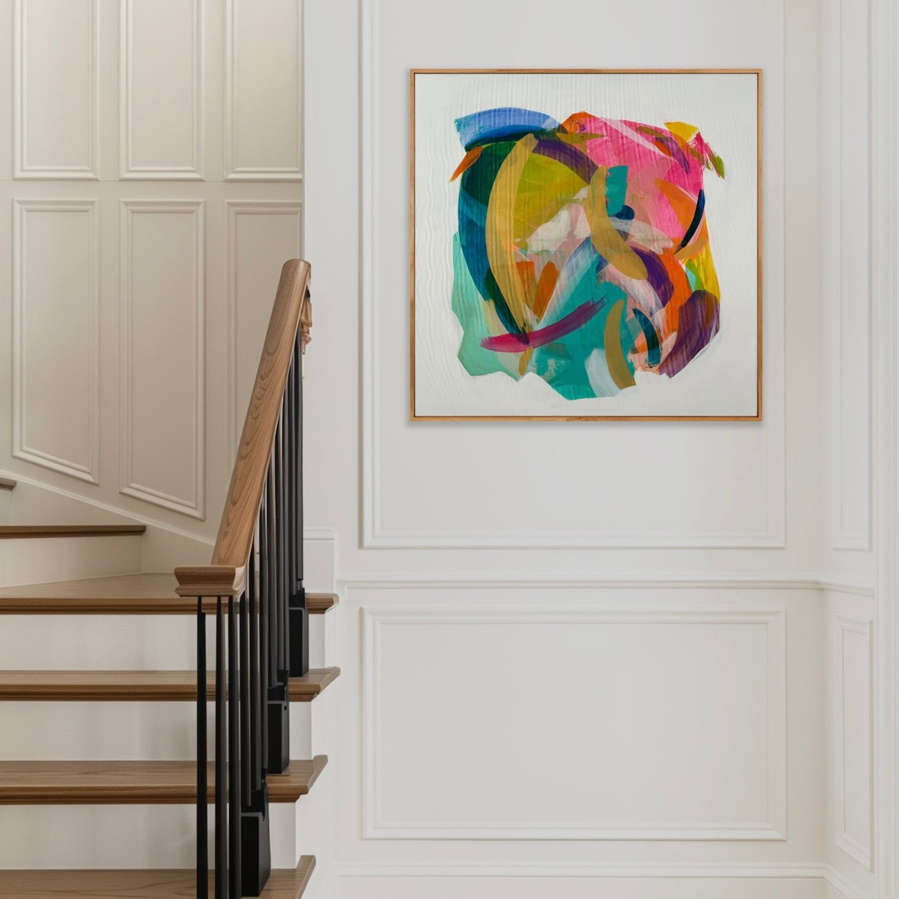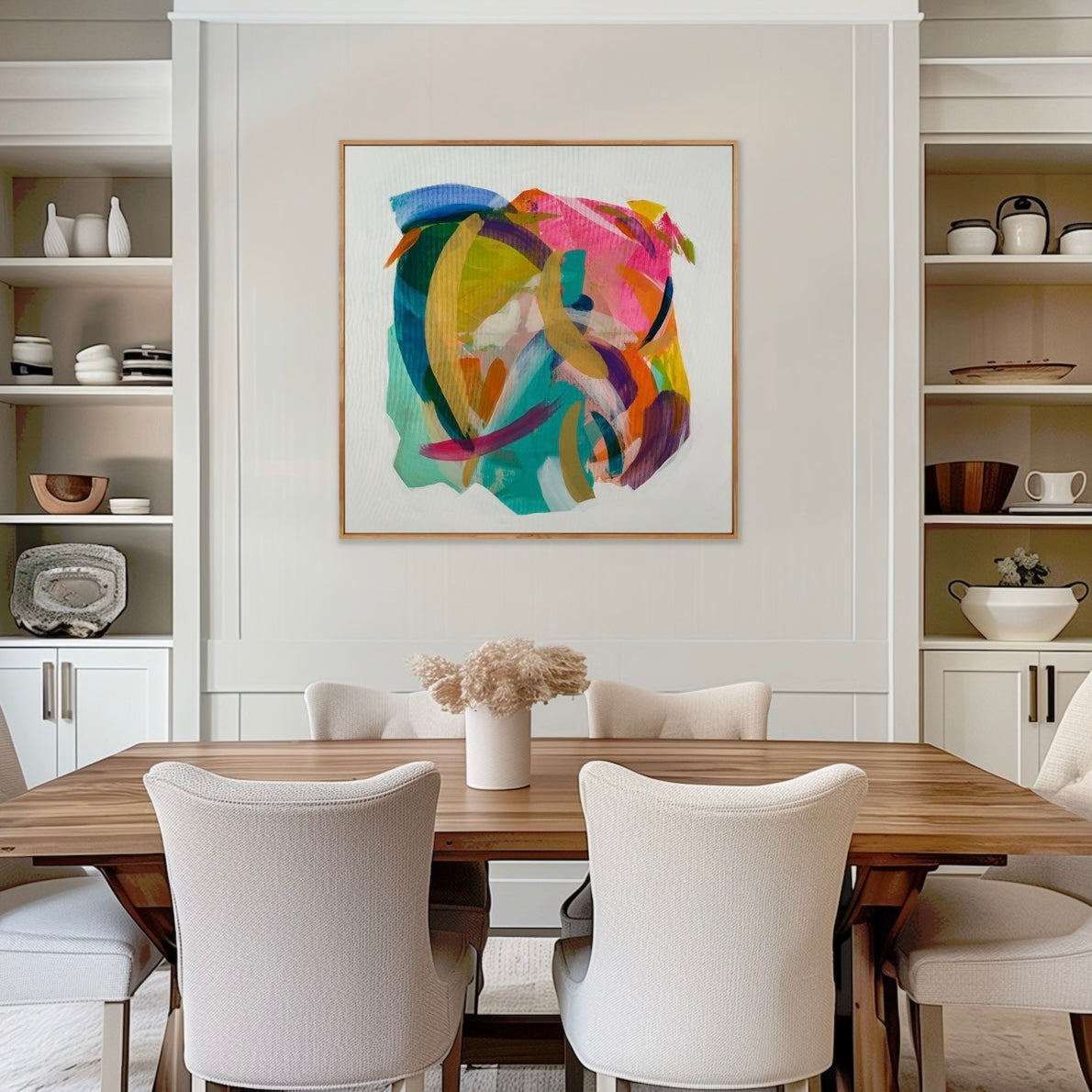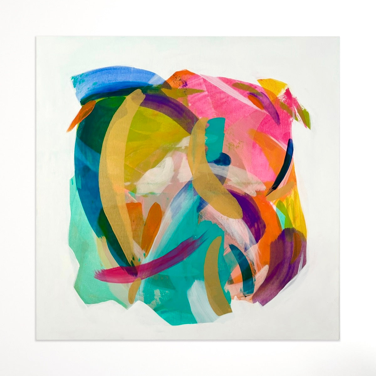 Gently crafted, Cosmos is a vibrant and minimalistic abstract painting that will elevate any space. With its colorful composition against a white background, this original work of art will bring a touch of modern elegance to your home or office.