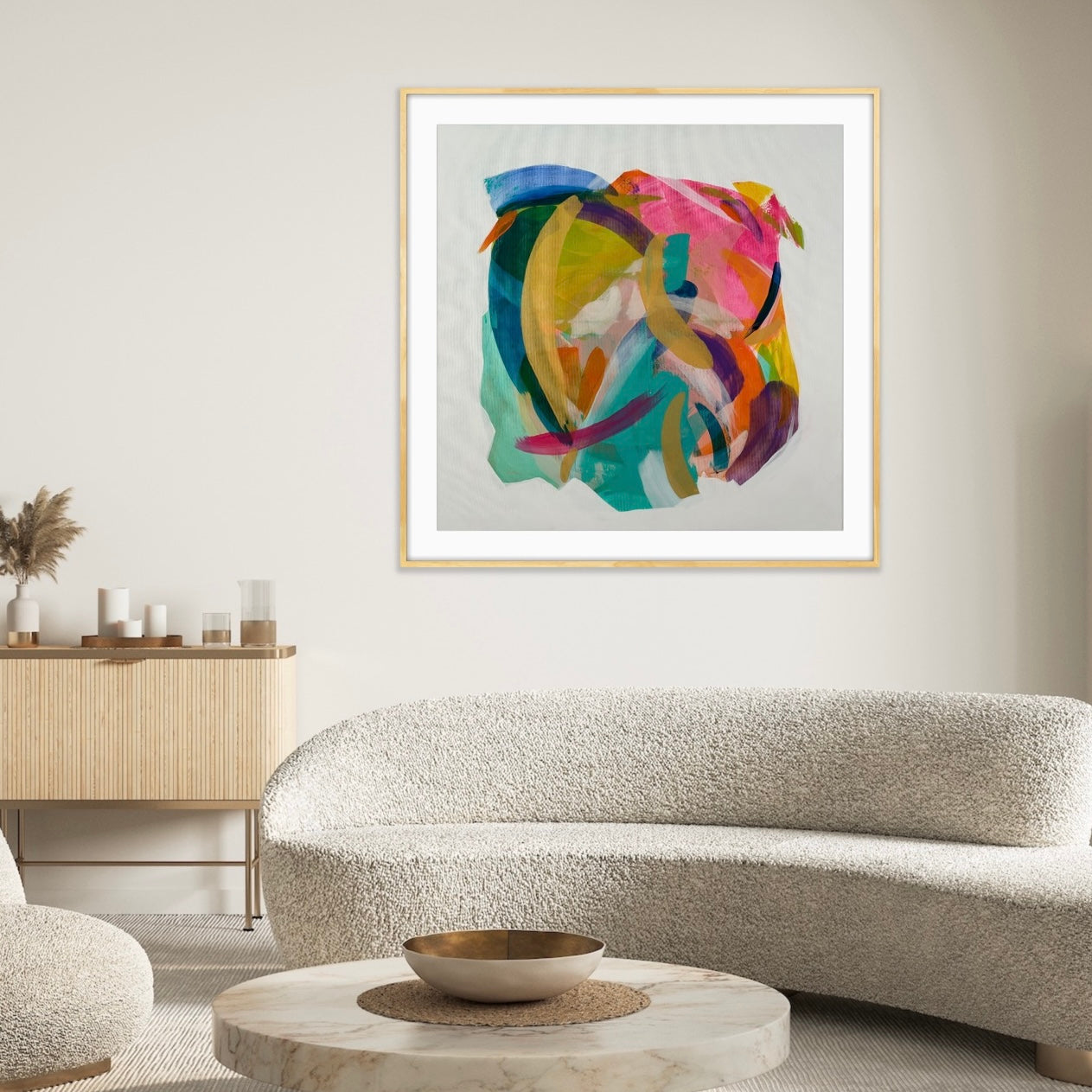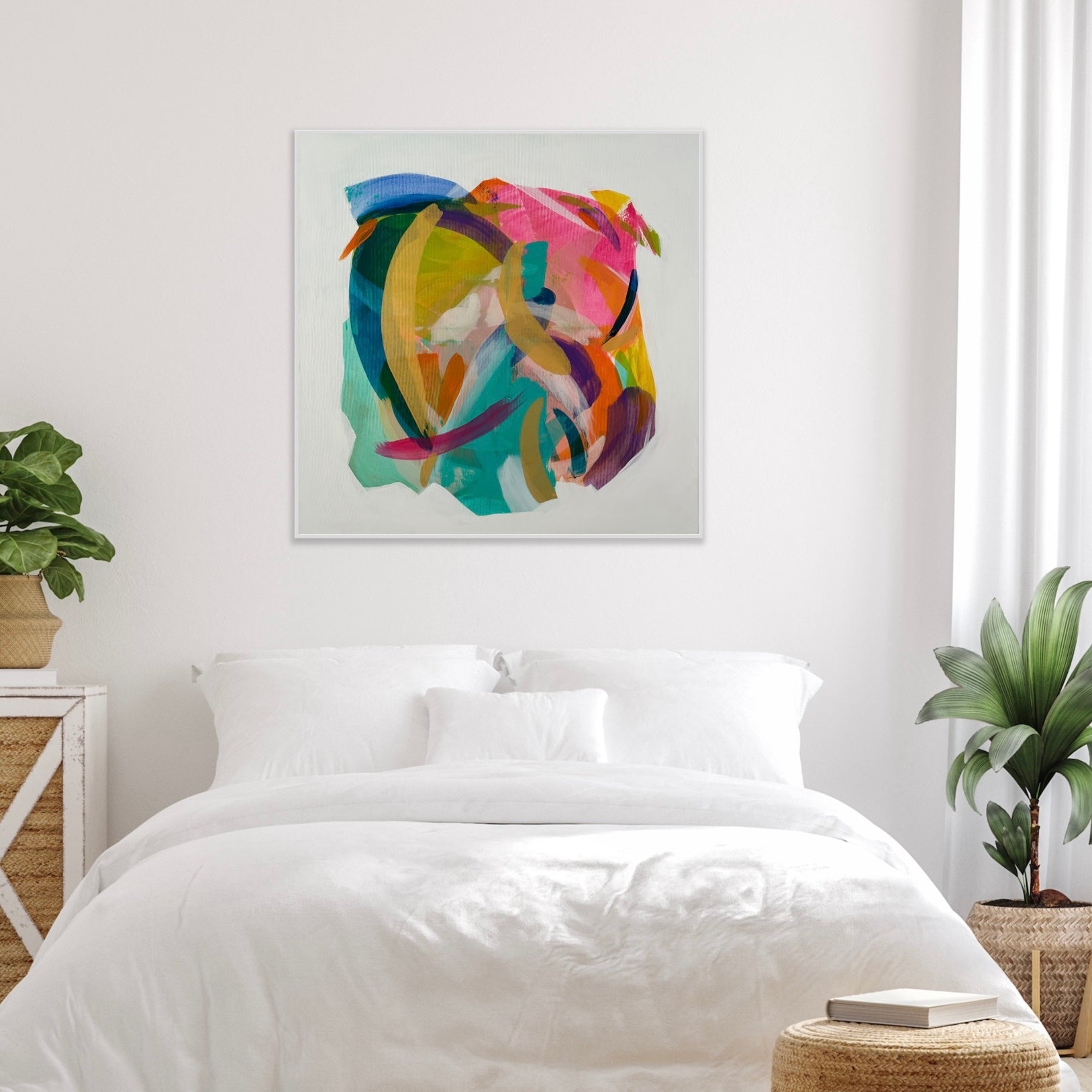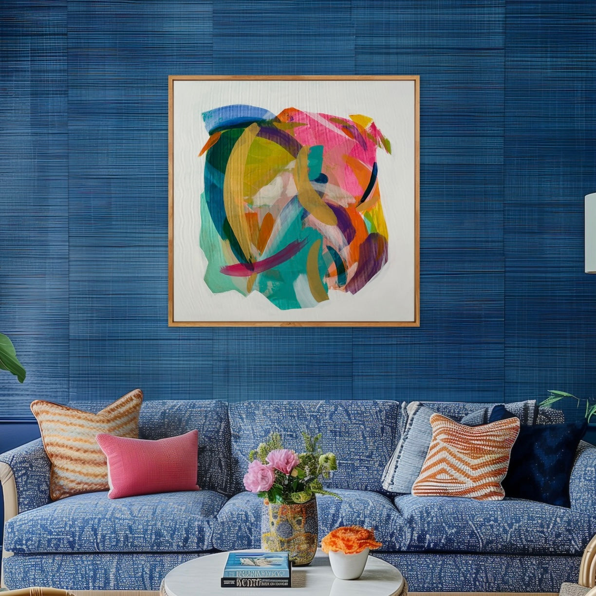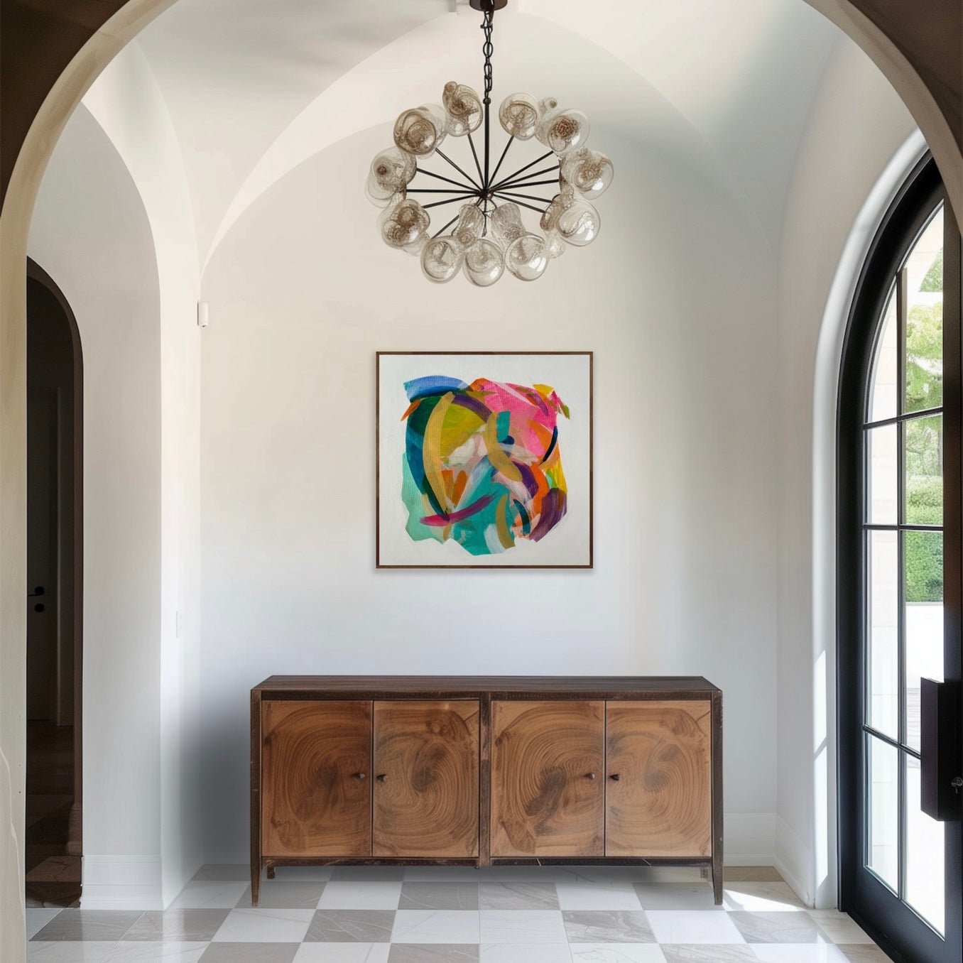 Gently crafted, Cosmos is a vibrant and minimalistic abstract painting that will elevate any space. With its colorful composition against a white background, this original work of art will bring a touch of modern elegance to your home or office.
