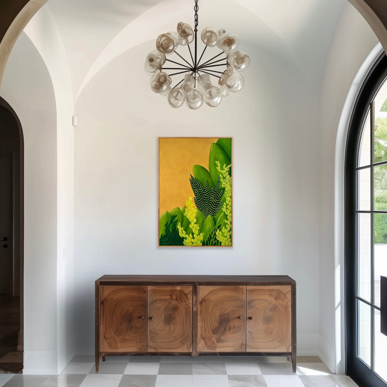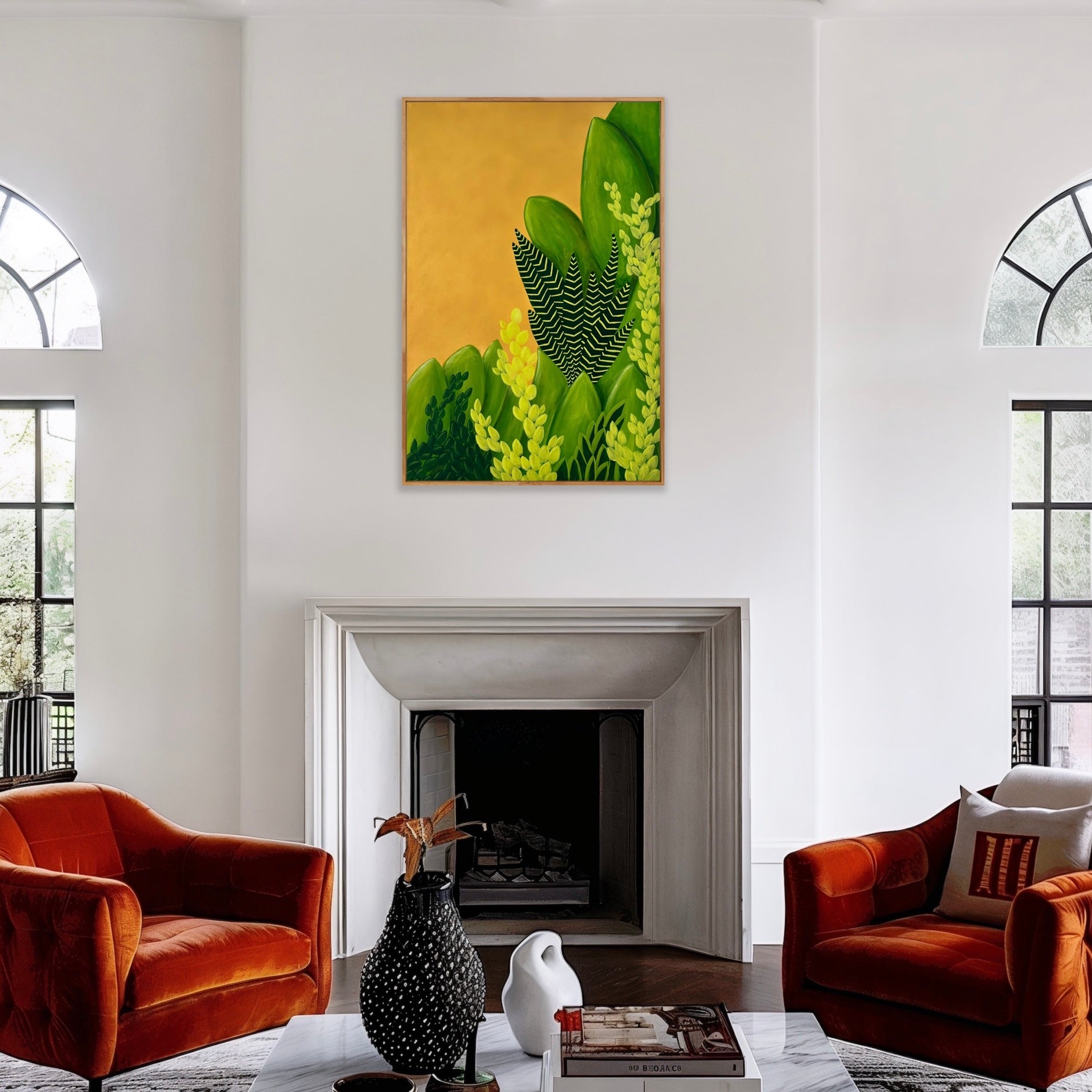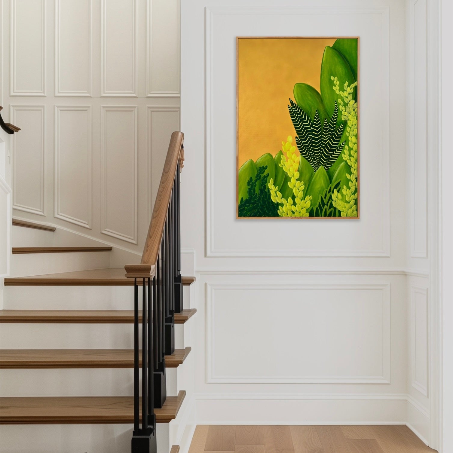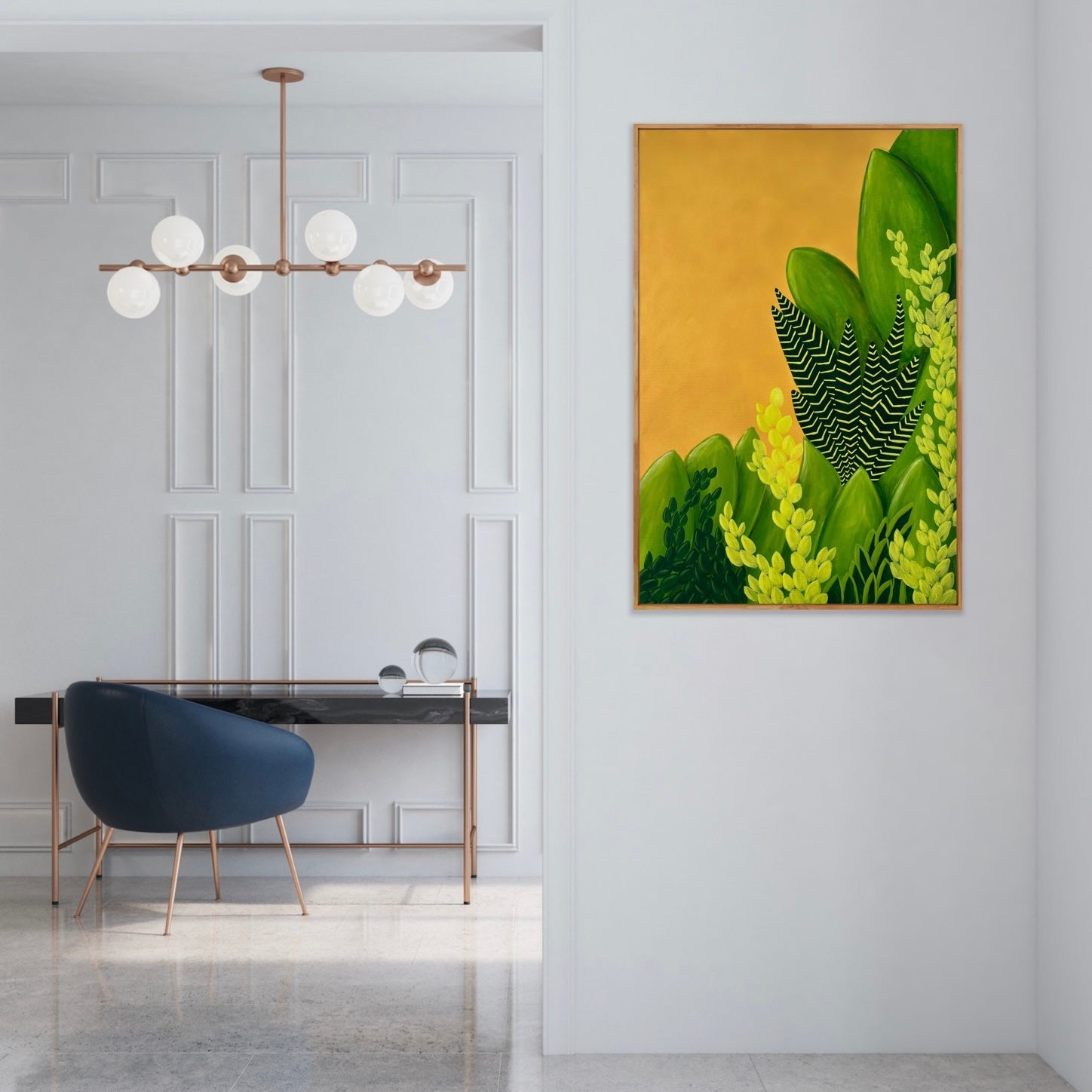 Experience the infusion of vibrant energy in your space with my Gold Leafs. Featuring an abstract painting of plants on a shimmering gold background, my painting is a perfect blend of art and energy. Elevate your surroundings and invite positivity with this unique piece.