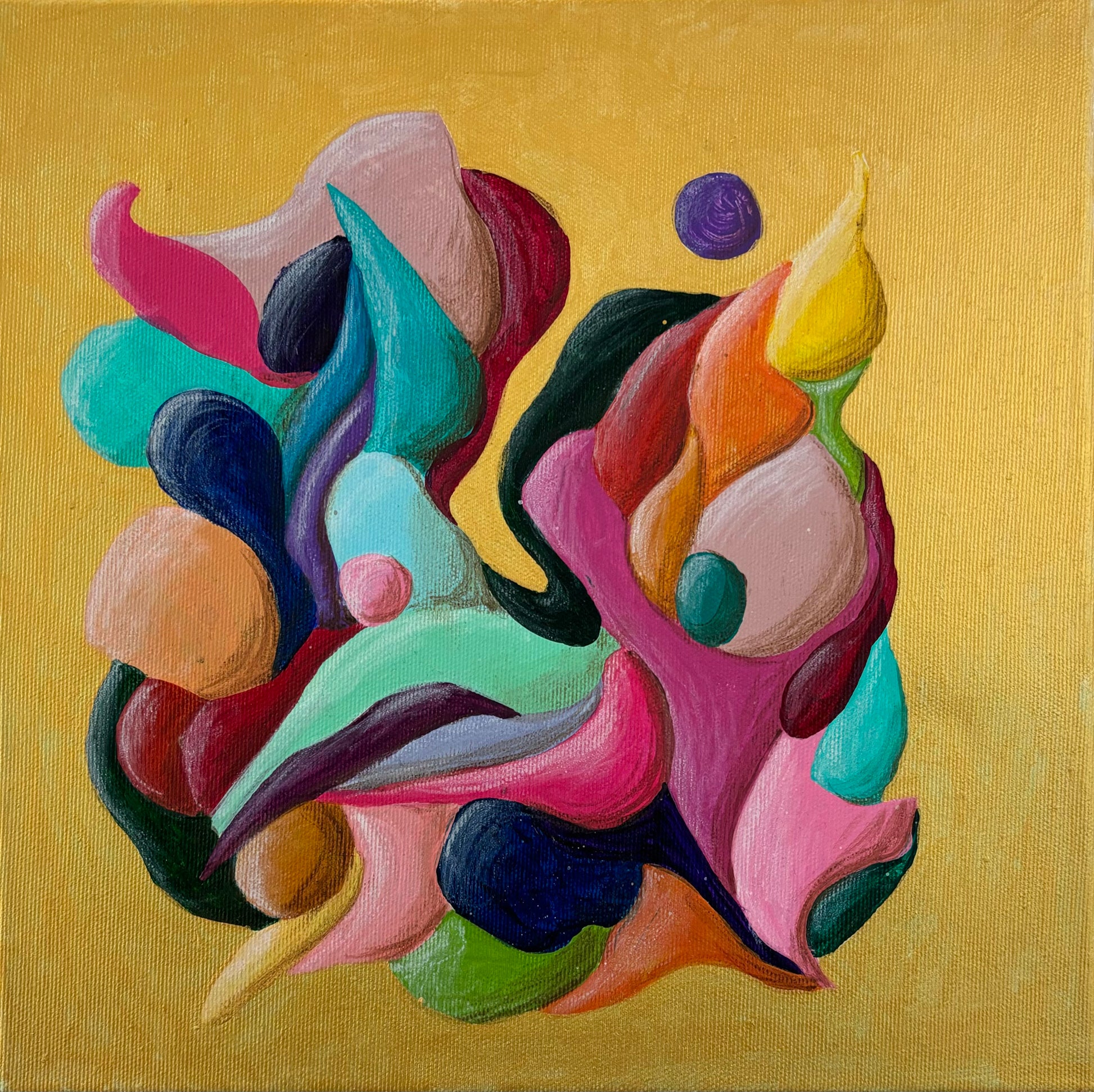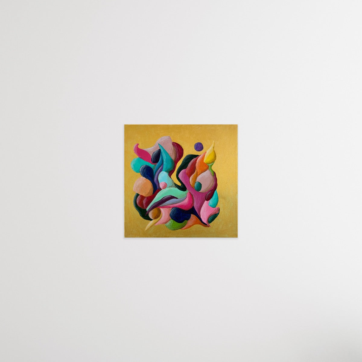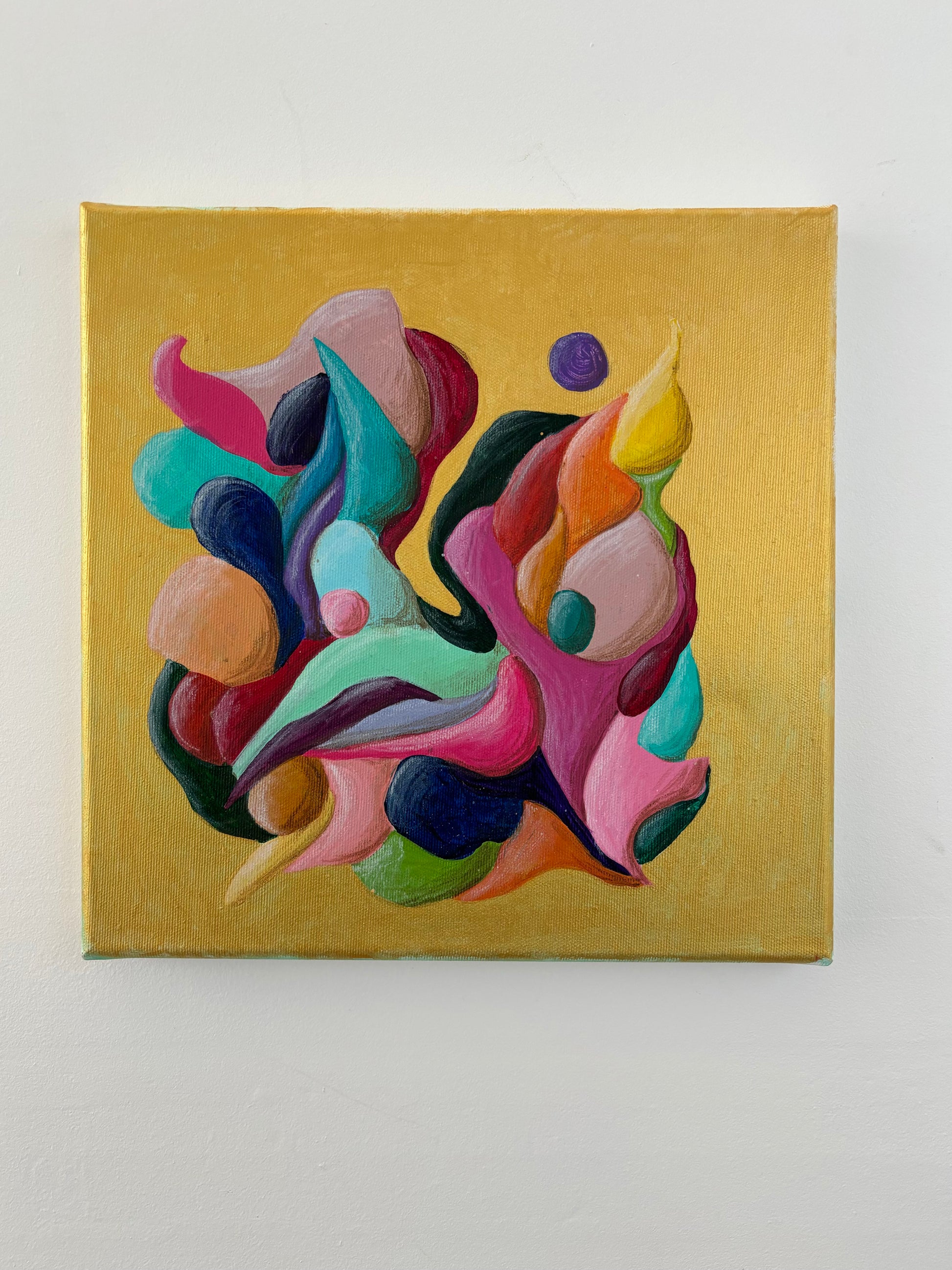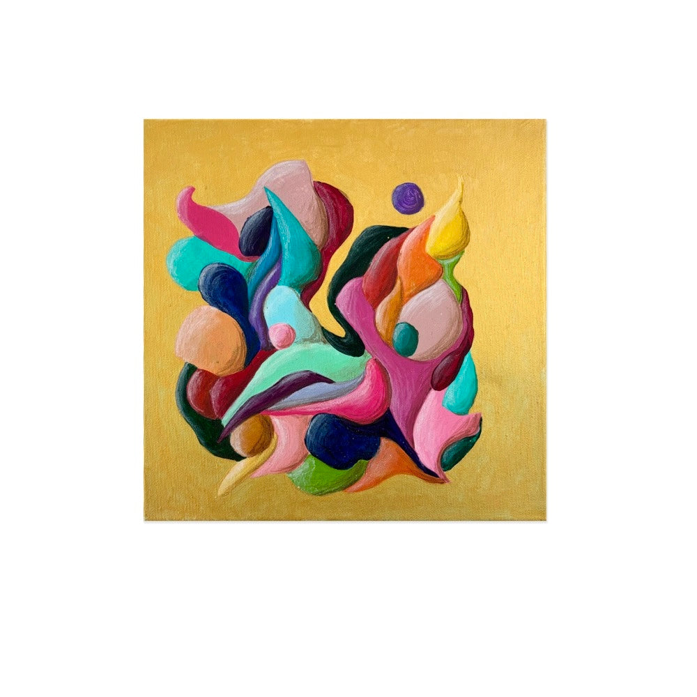 Introducing "Just a Moment", a small abstract painting that bursts with colorful movement against a striking gold background. This energetic flow creates a dynamic and vibrant visual experience. Perfect for adding a touch of lively sophistication to any space.