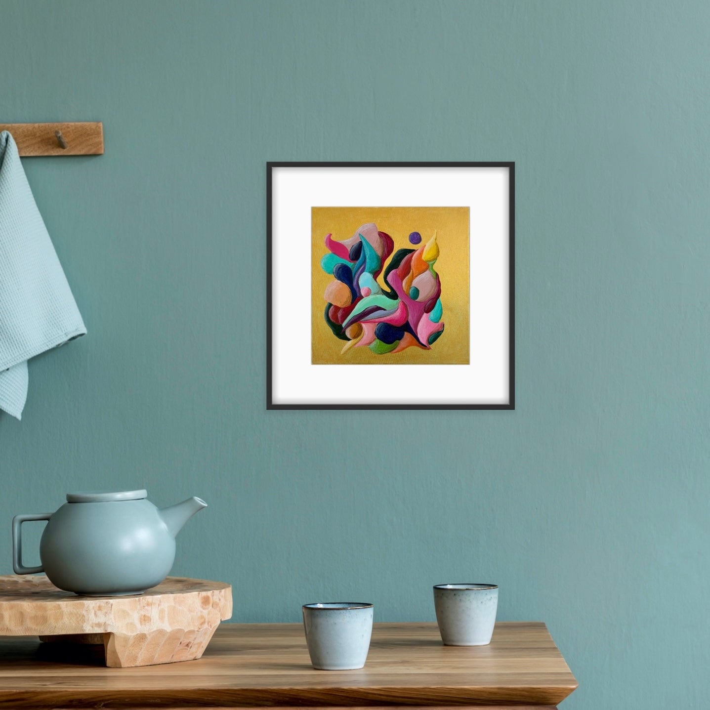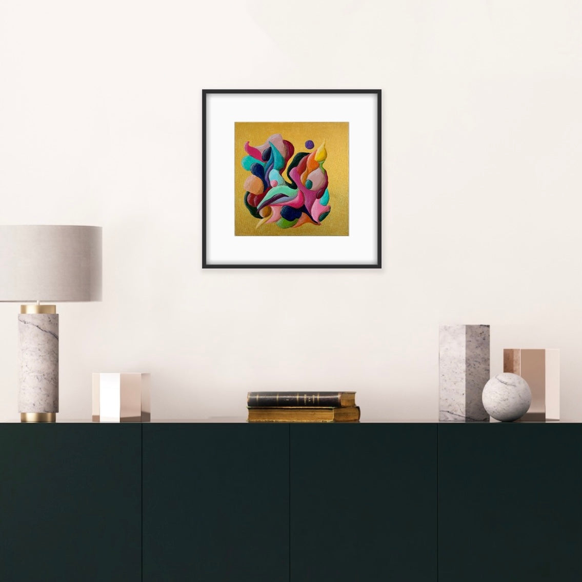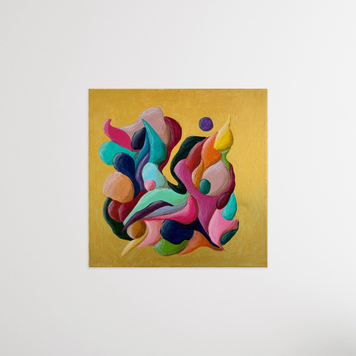 Introducing "Just a Moment", a small abstract painting that bursts with colorful movement against a striking gold background. This energetic flow creates a dynamic and vibrant visual experience. Perfect for adding a touch of lively sophistication to any space.