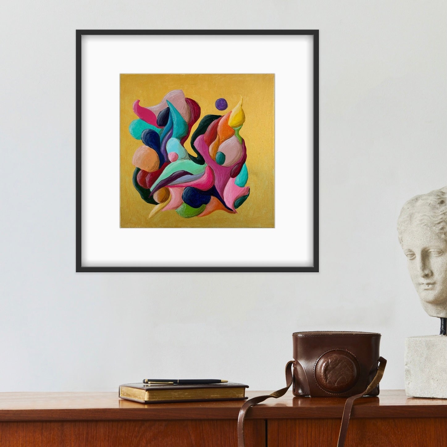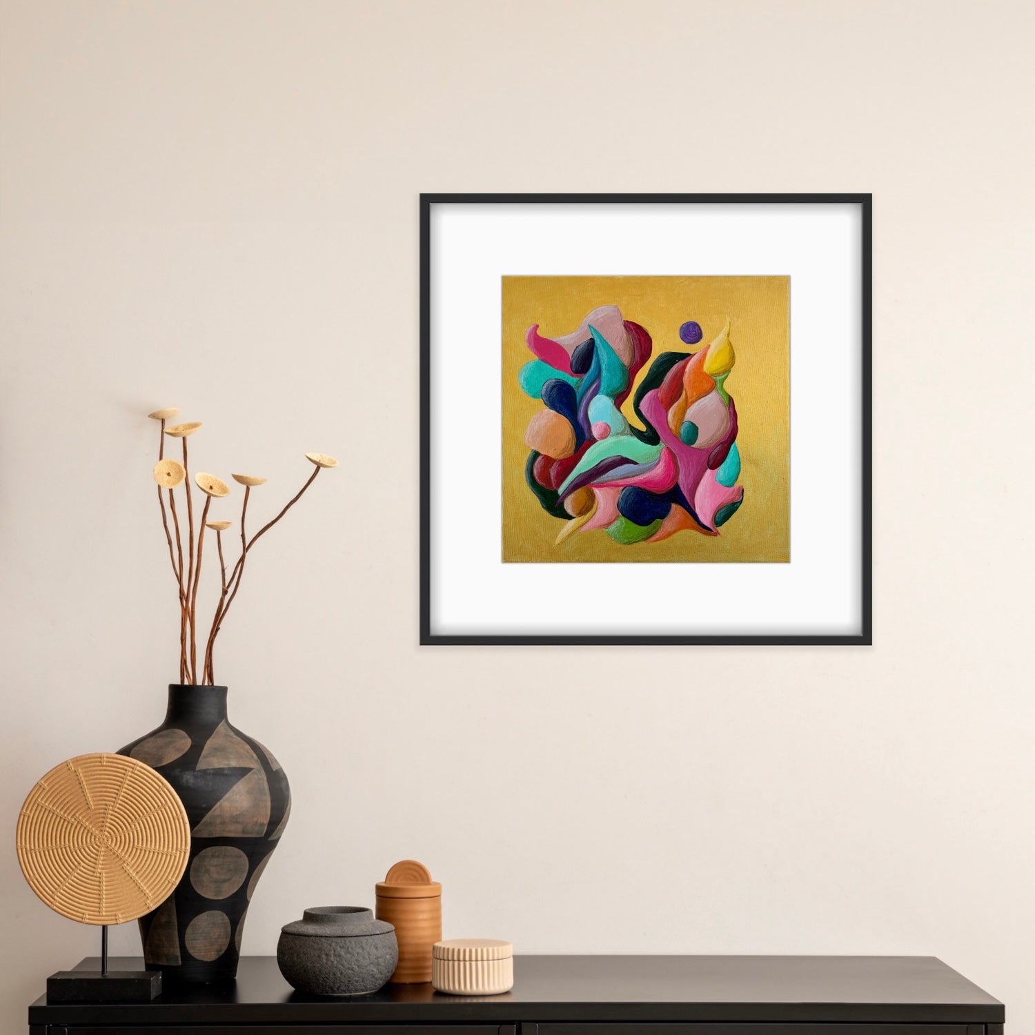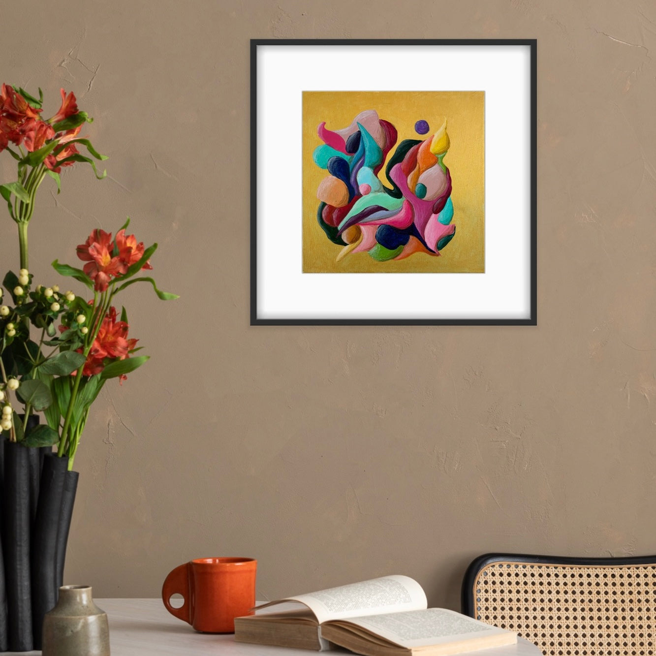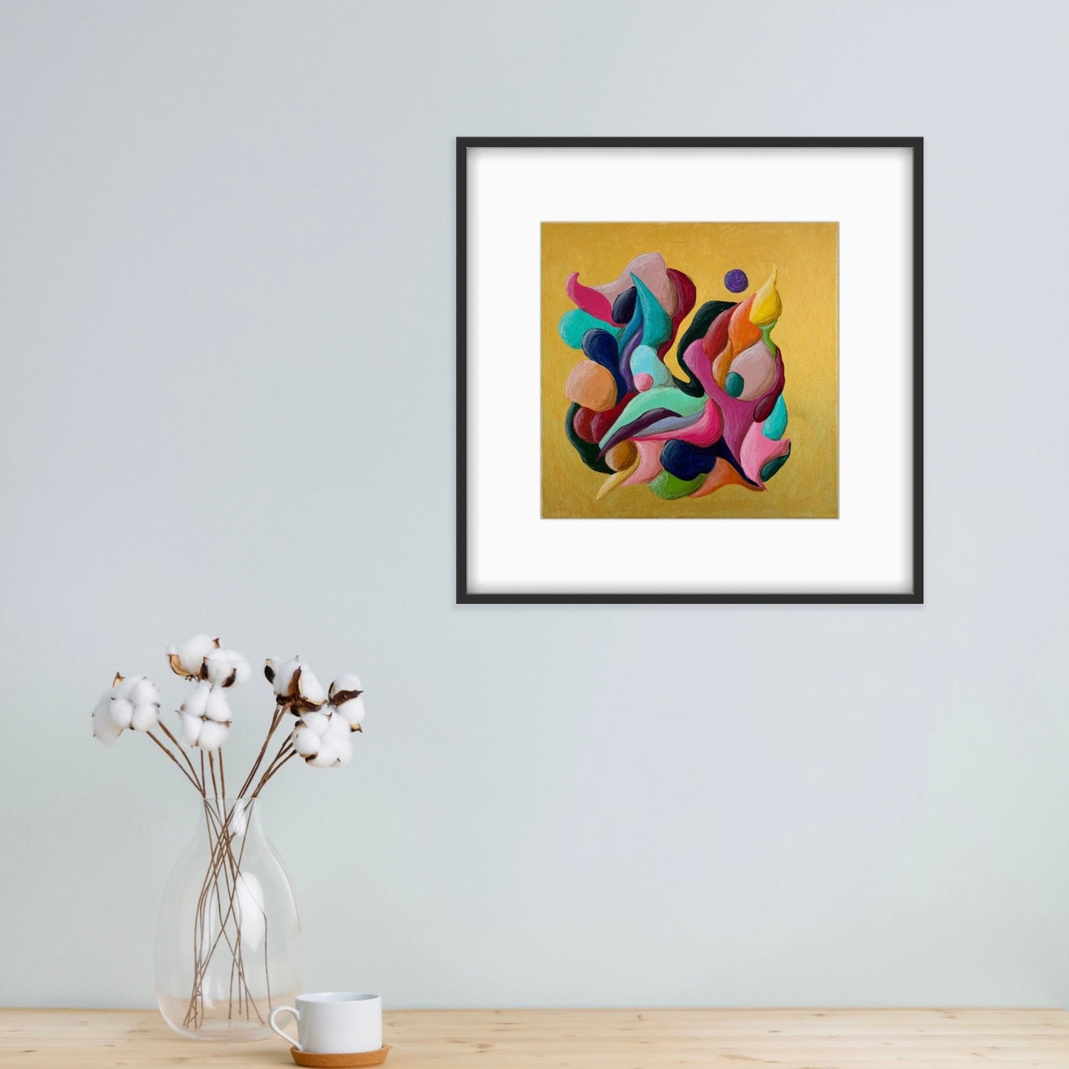 Introducing "Just a Moment", a small abstract painting that bursts with colorful movement against a striking gold background. This energetic flow creates a dynamic and vibrant visual experience. Perfect for adding a touch of lively sophistication to any space.