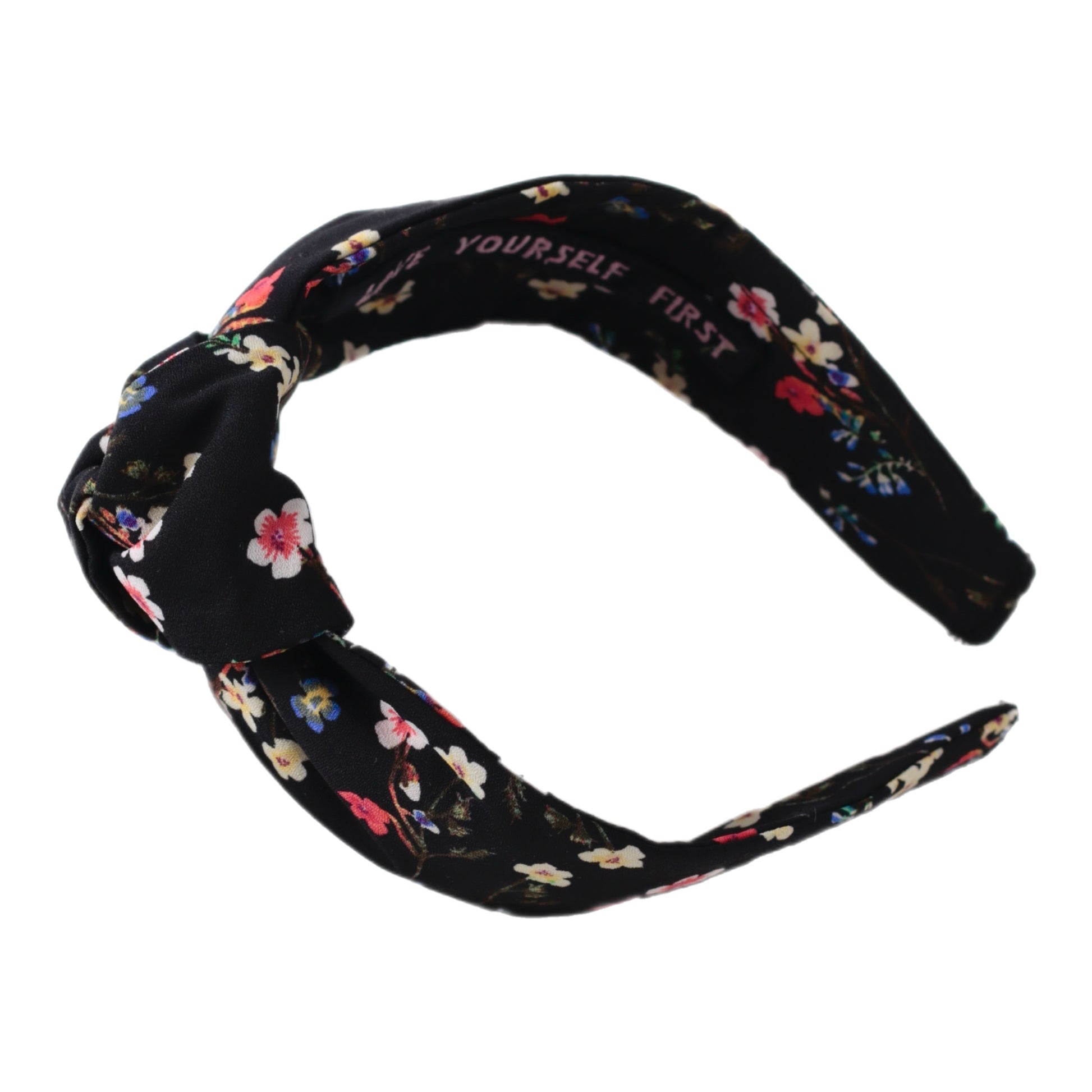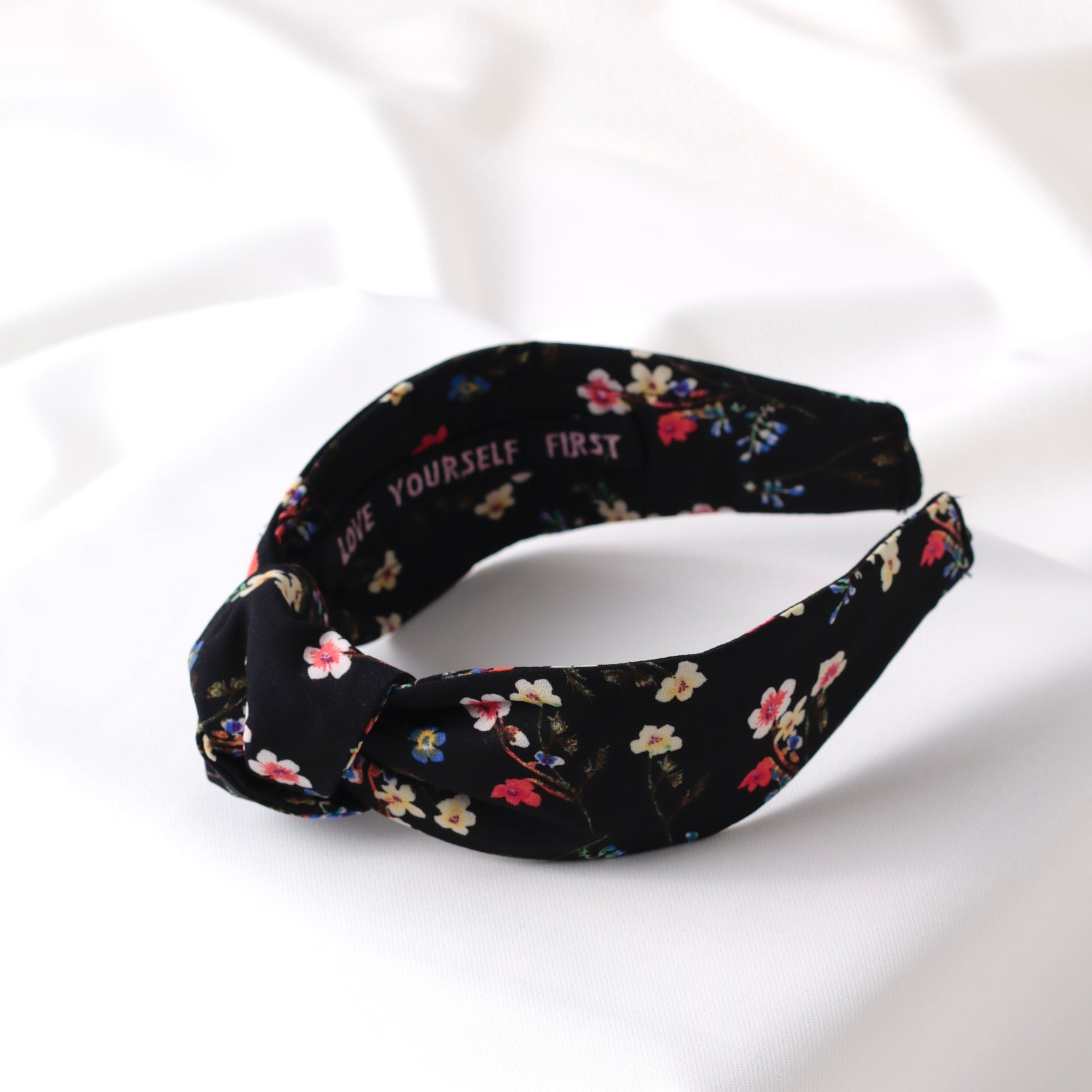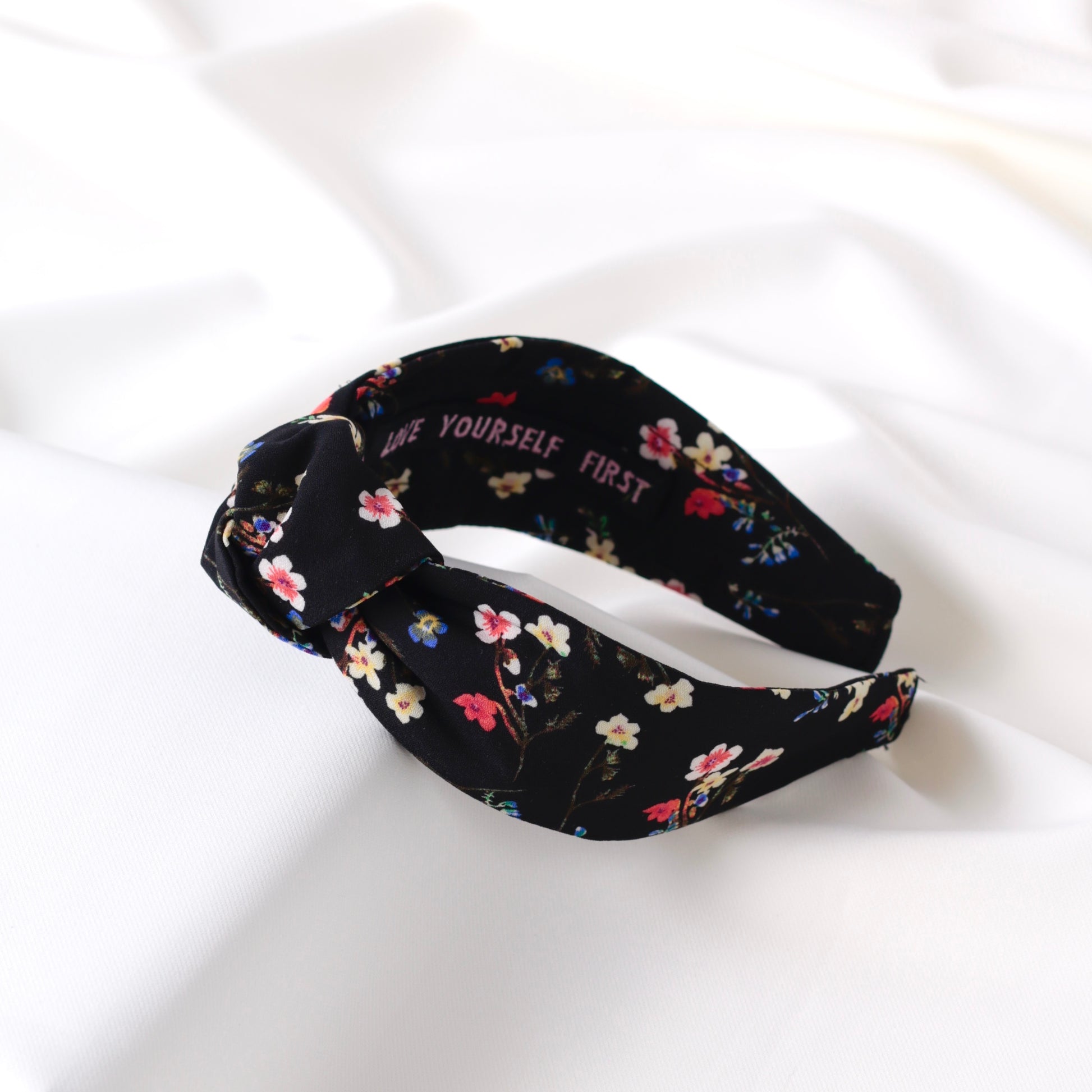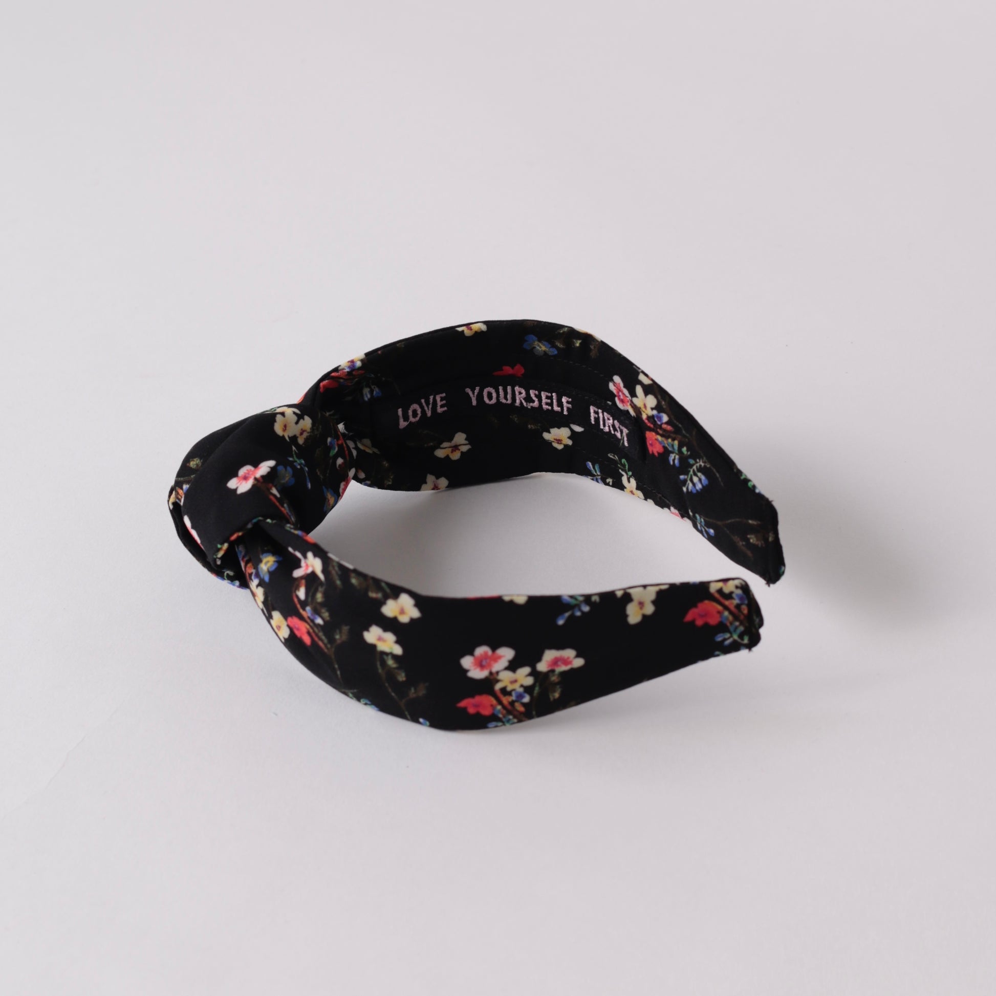 Make your day better and motivated with my Black Mini Floral Knot Headband. Gentle on delicate hair, this headband provides a comfy way to keep those locks in place and motivate your mind during the day. Inside of the headband is embroidered motivational quote “LOVE YOURSELF FIRST”.