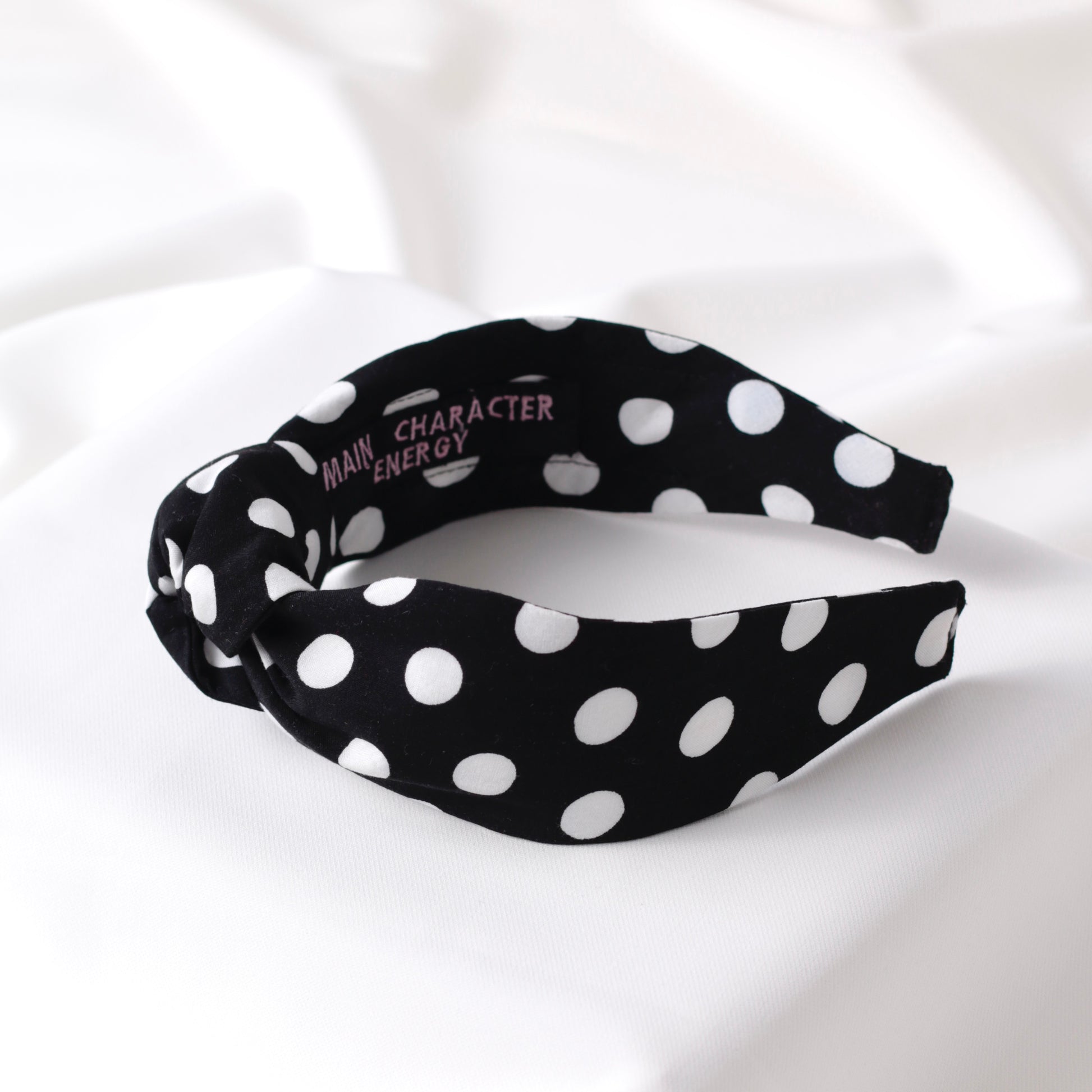 Make your day better and motivated with my Black and White Dotty Knot Headband. Gentle on delicate hair, this headband provides a comfy way to keep those locks in place and motivate your mind during the day. Inside of the headband is embroidered motivational quote “MAIN CHARACTER ENERGY”.