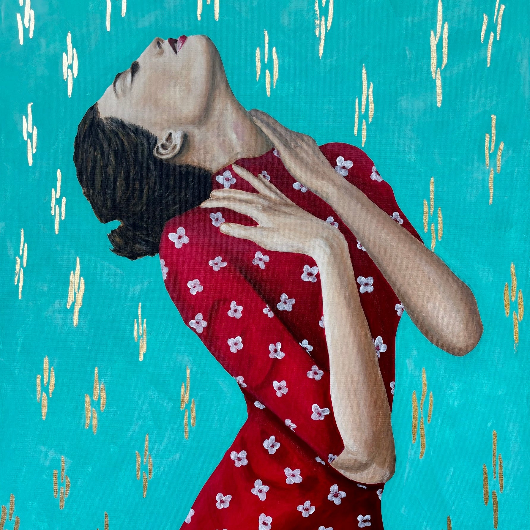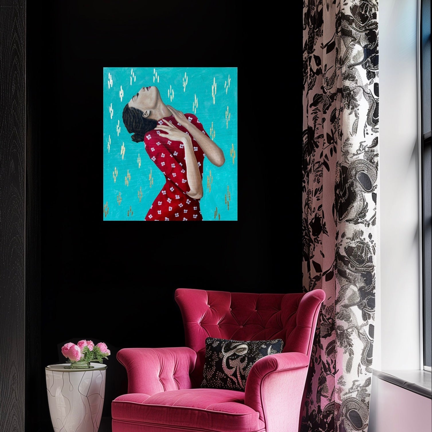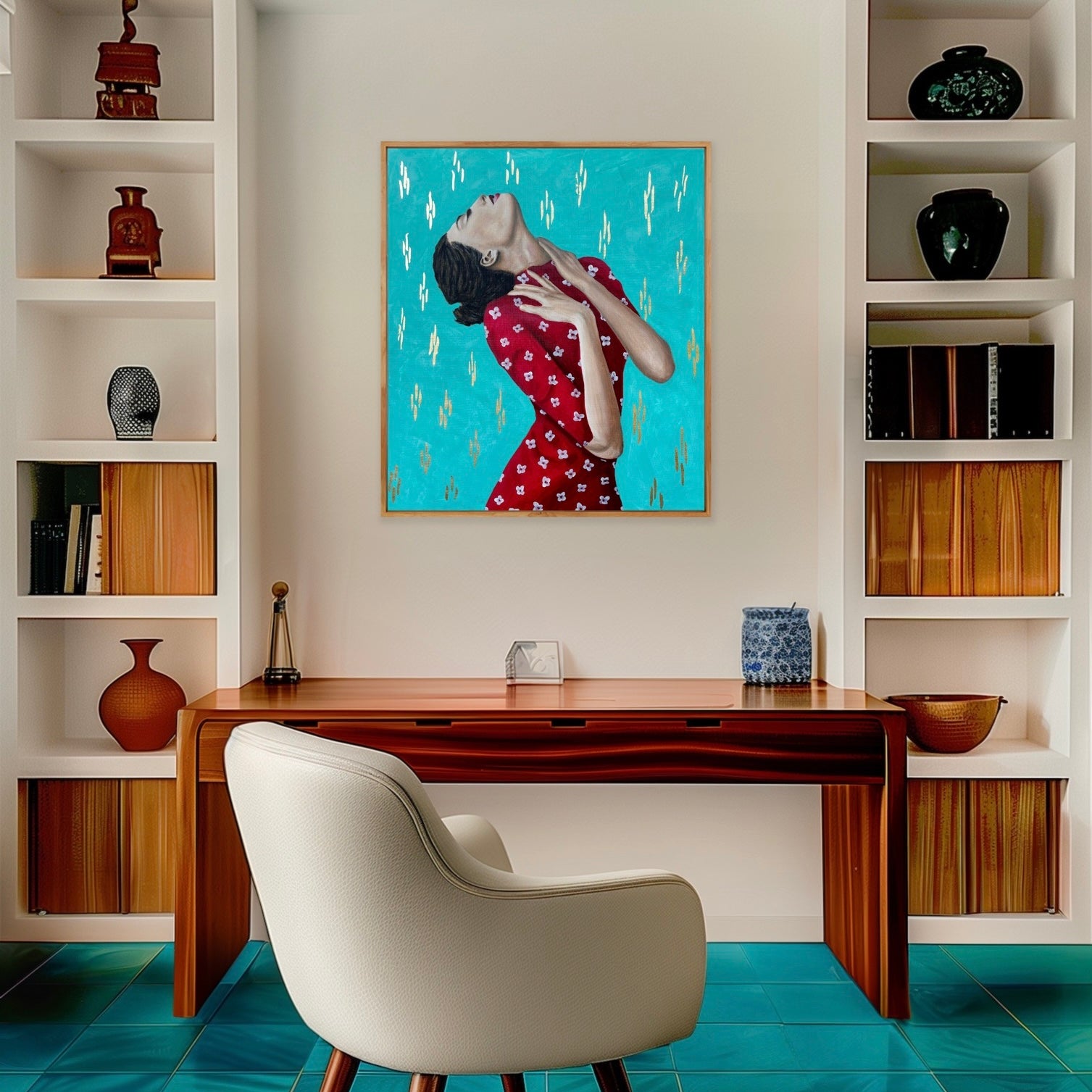 This original painting on canvas features a striking lady in a red dress set against a vibrant turquoise background adorned with gold leaves. The artwork emphasizes femininity and the essence of the present moment, capturing both elegance and vitality through its vivid colors. Ideal for those who appreciate expressive, contemporary art that celebrates strength and beauty.