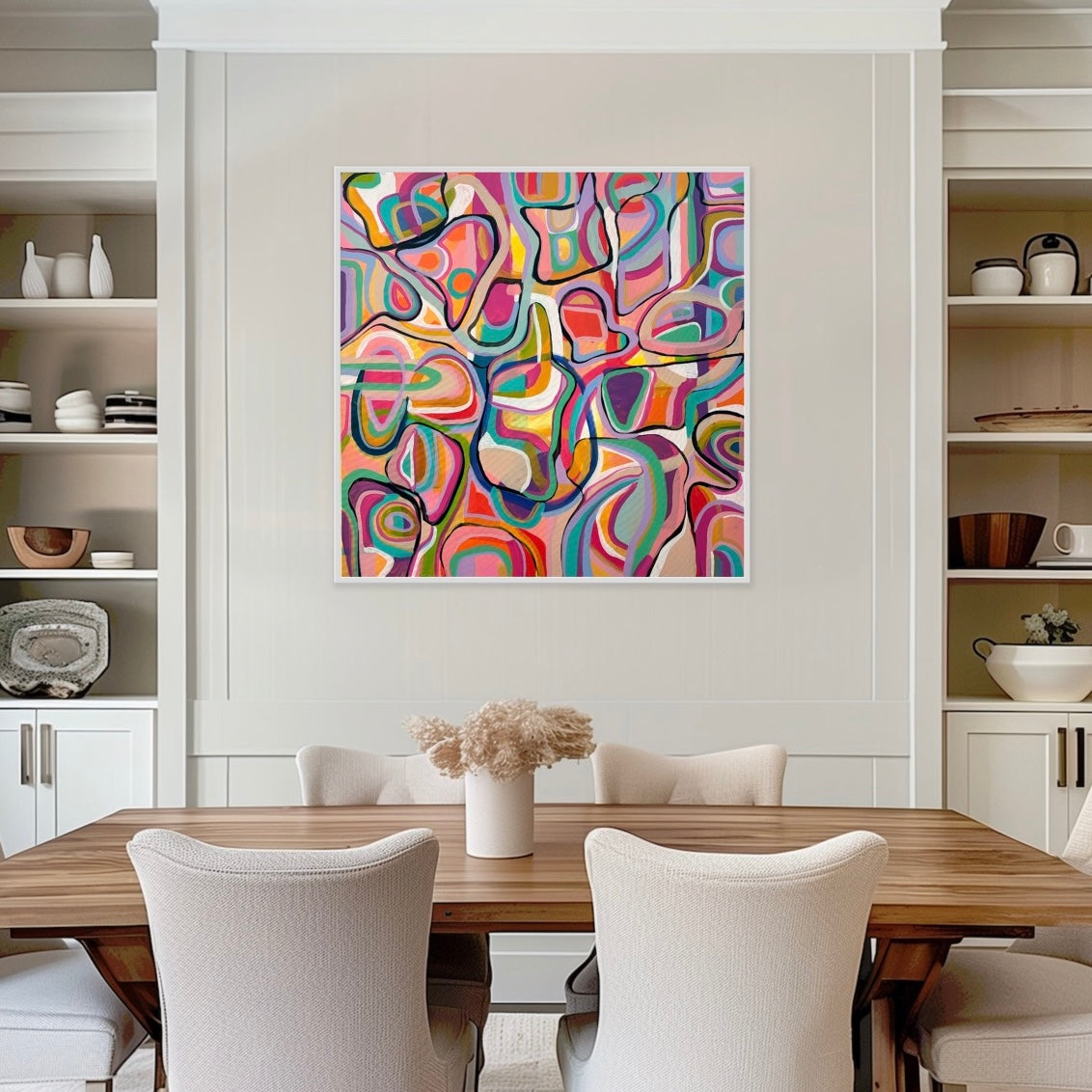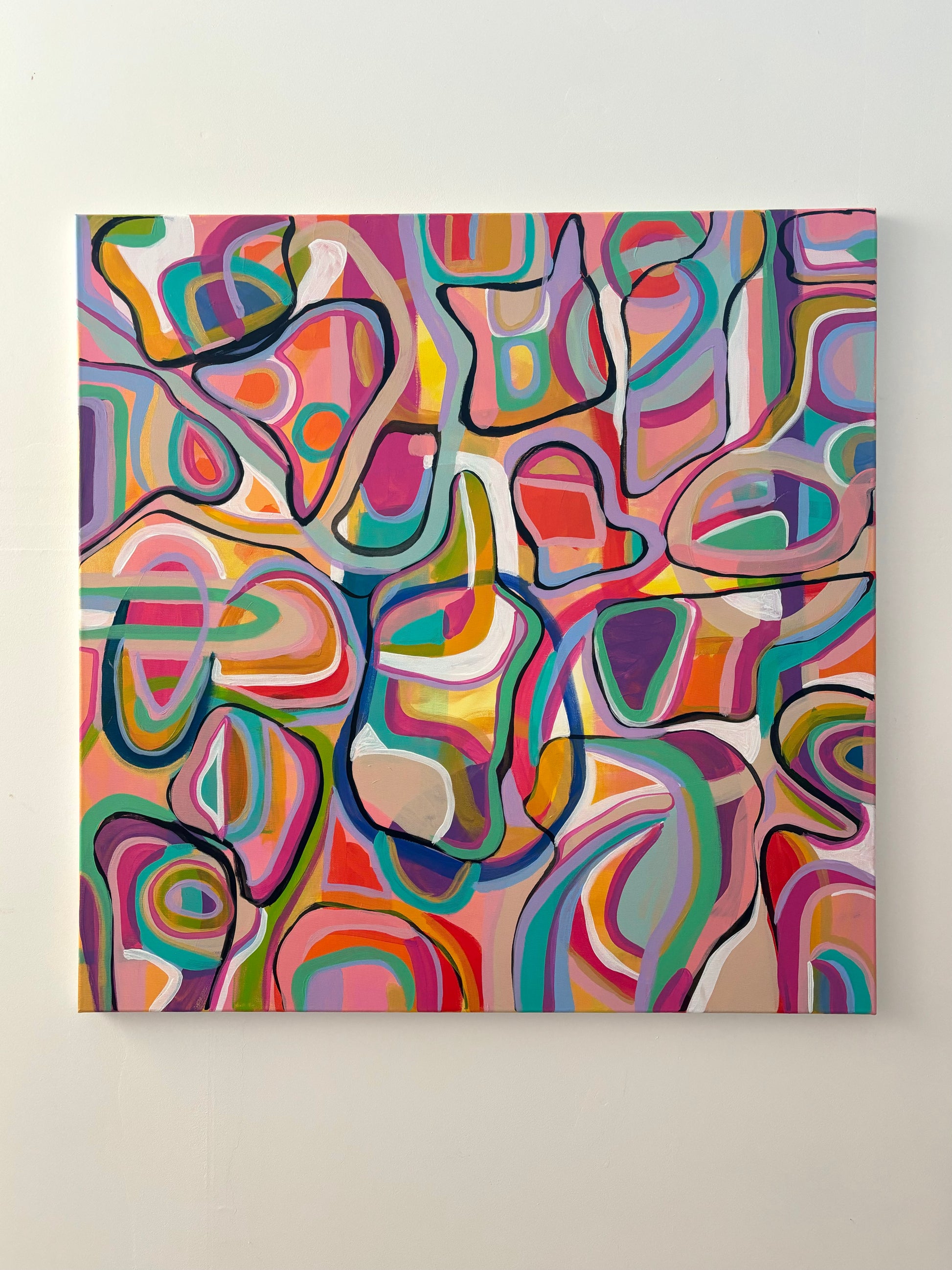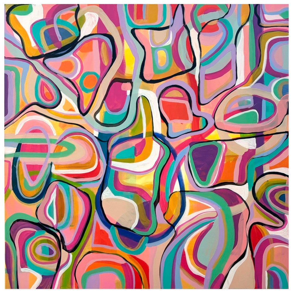 Introducing "New Dimensions": a colorful painting featuring bold expressions that will boost your energy and add a unique touch of original art to any room. With its vibrant colors and strong visual impact, this piece is sure to invigorate your space and awaken your senses.