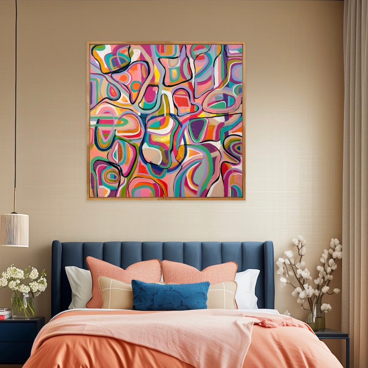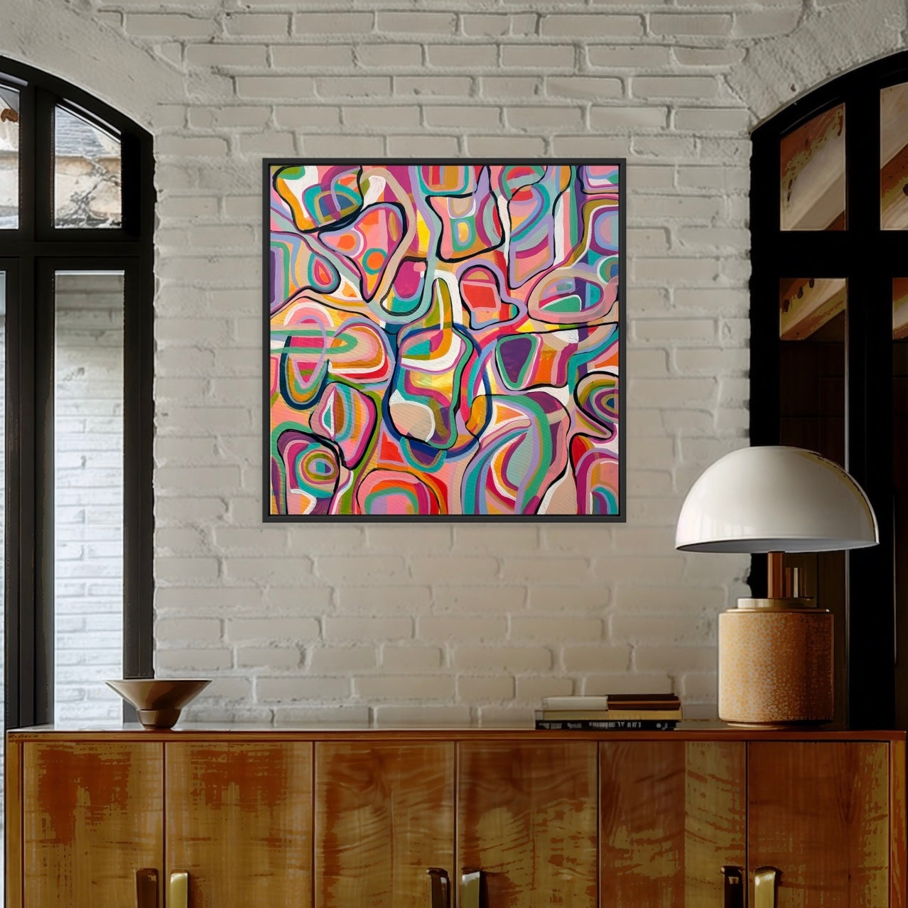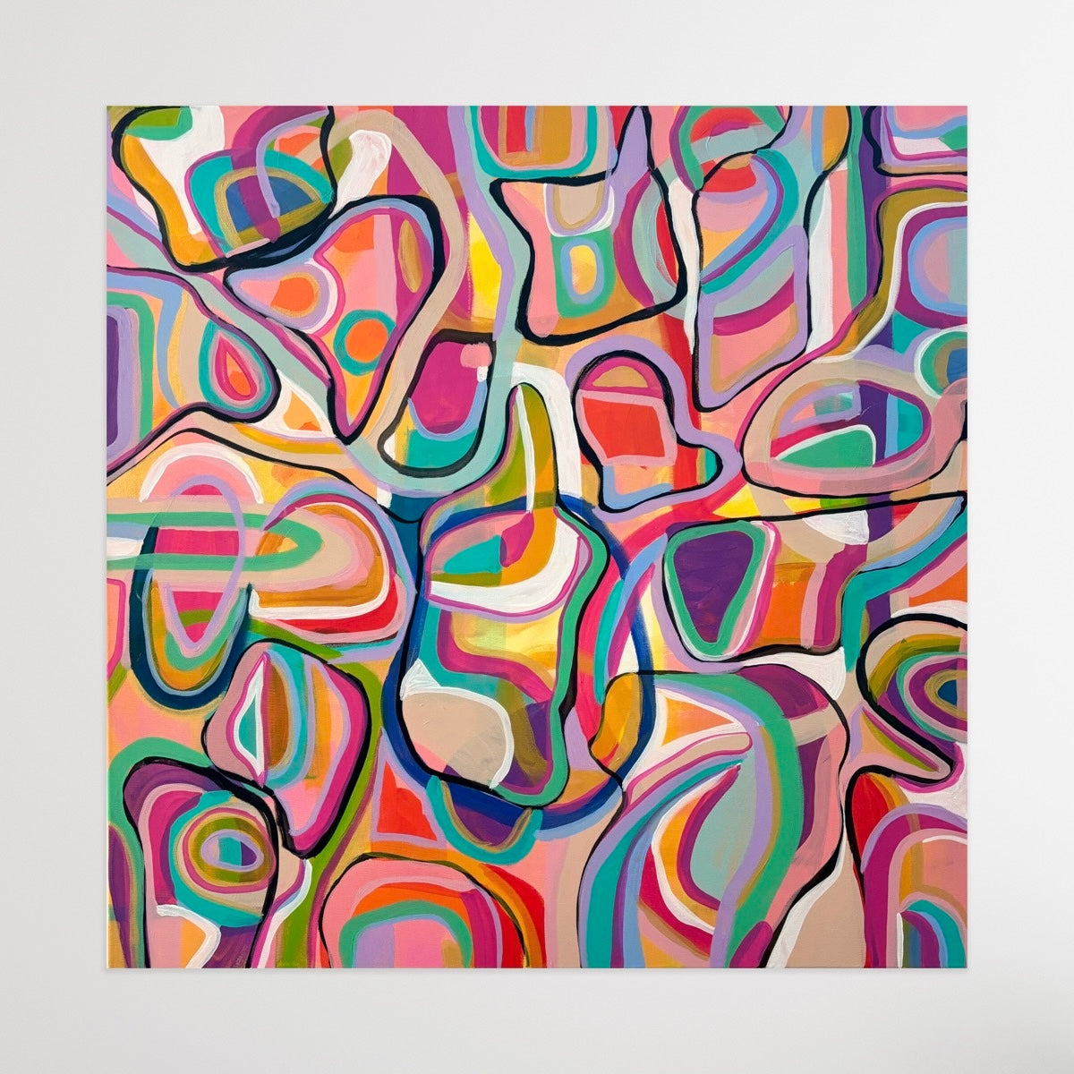 Introducing "New Dimensions": a colorful painting featuring bold expressions that will boost your energy and add a unique touch of original art to any room. With its vibrant colors and strong visual impact, this piece is sure to invigorate your space and awaken your senses.