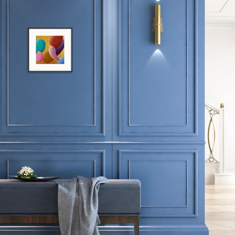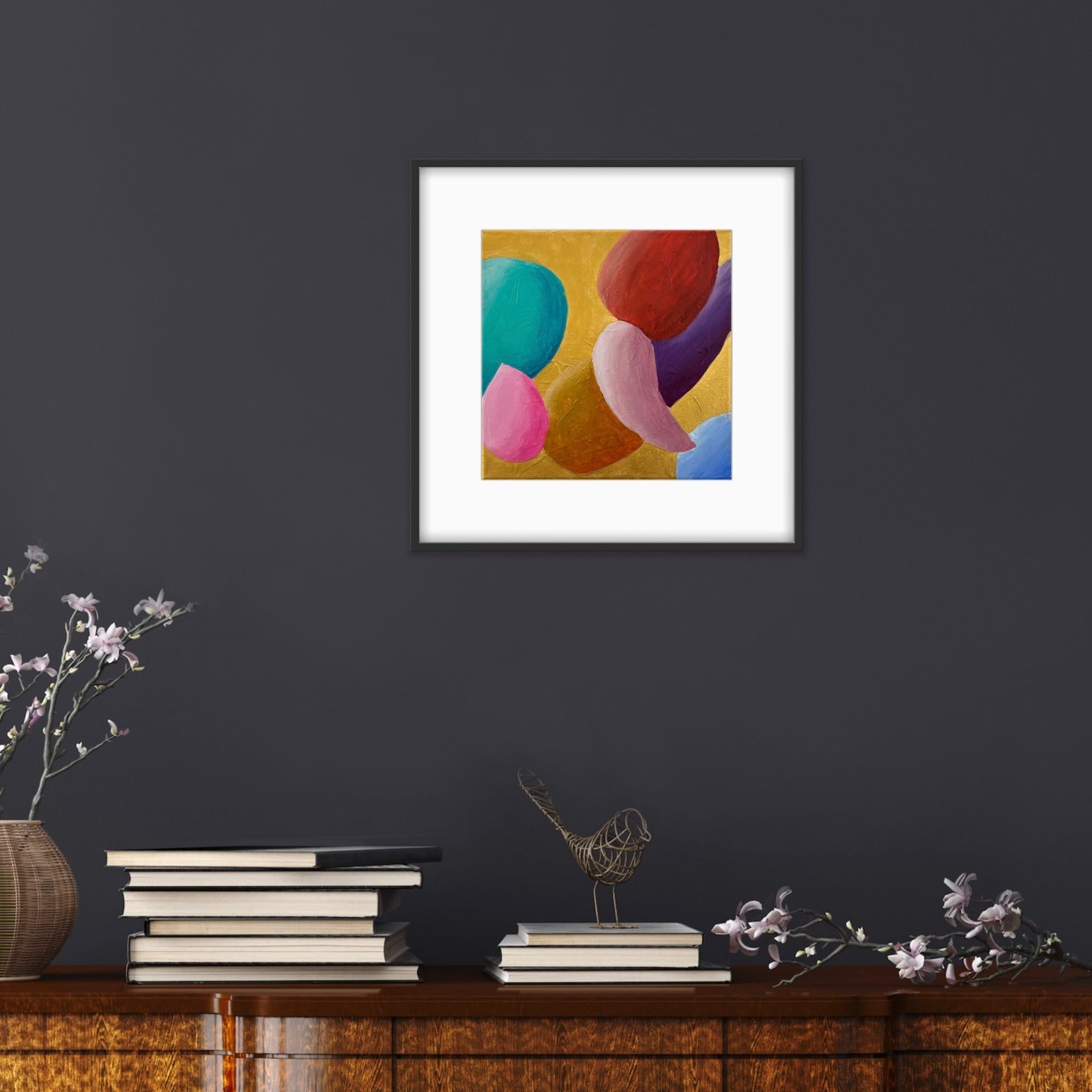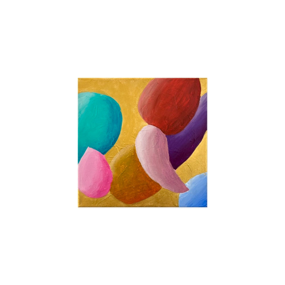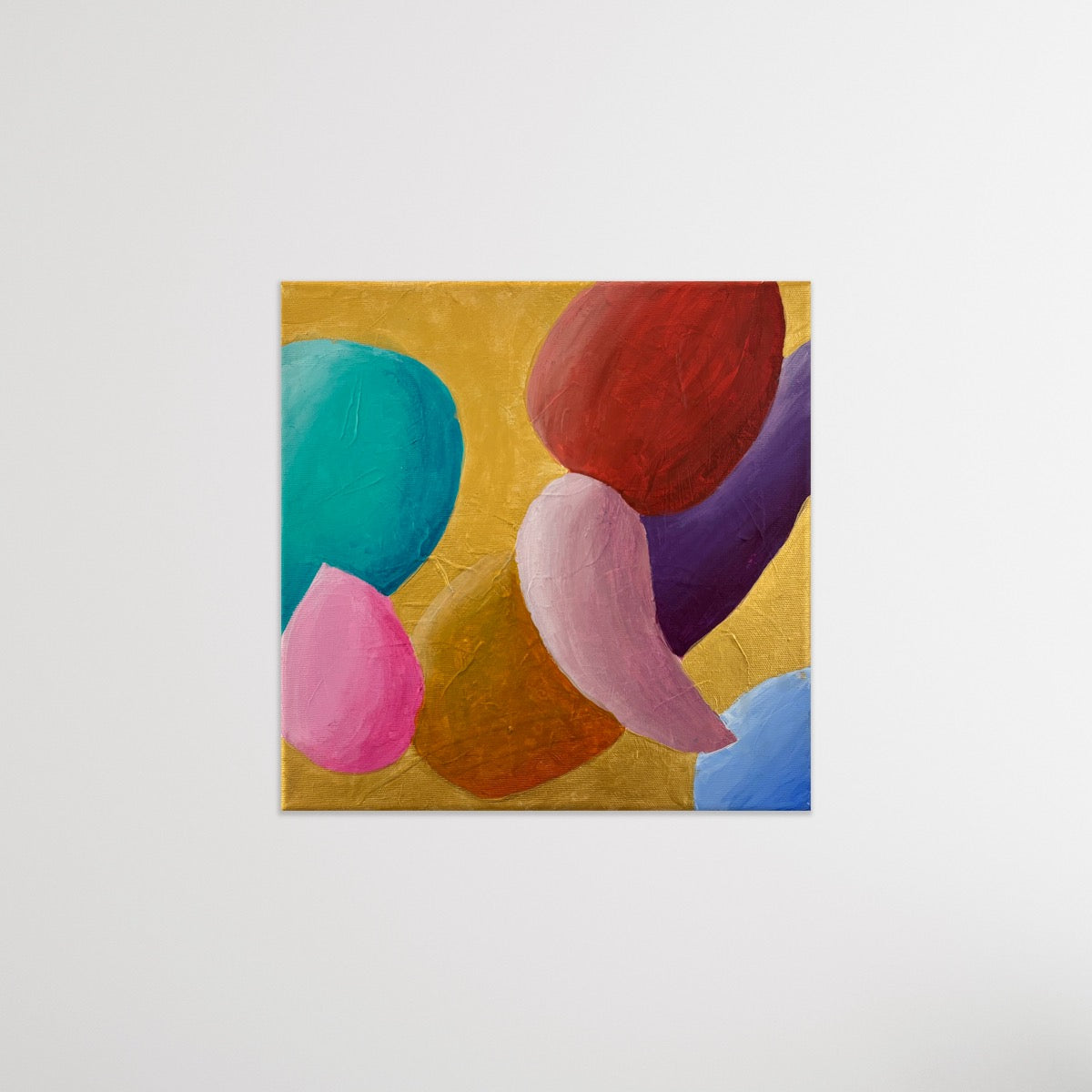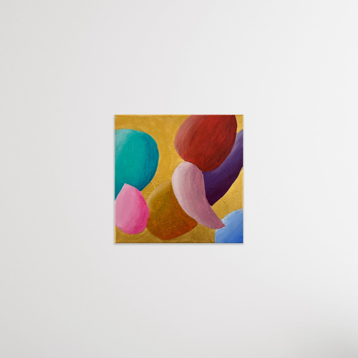This abstract painting features a small yet intricate design, bursting with vibrant colors that contrast against the luxurious gold background. With crafted details, this piece is sure to add a touch of artistic elegance to any space.