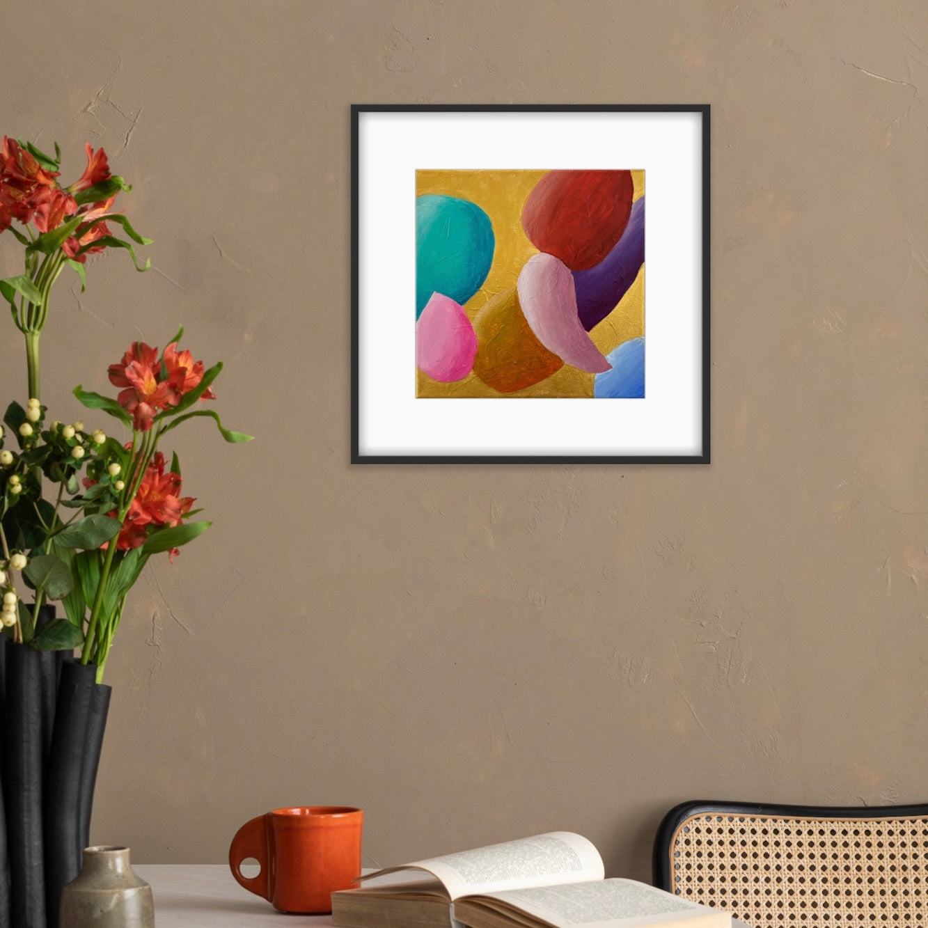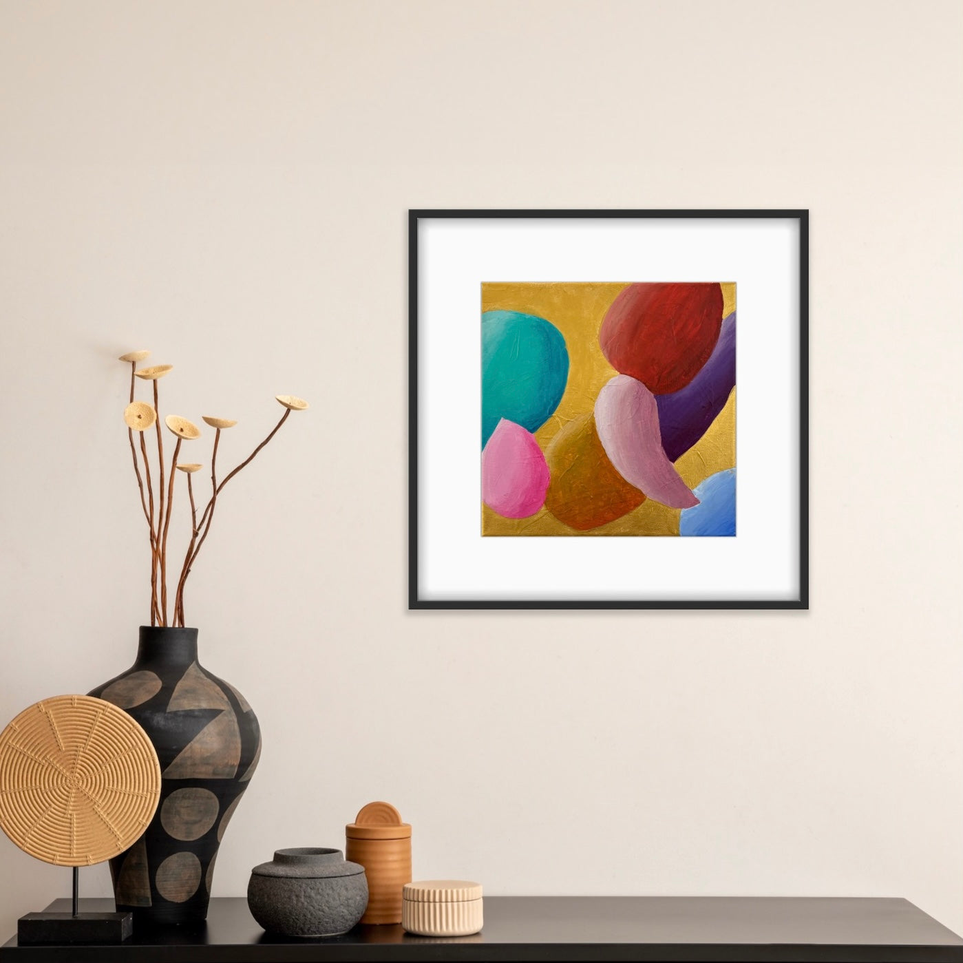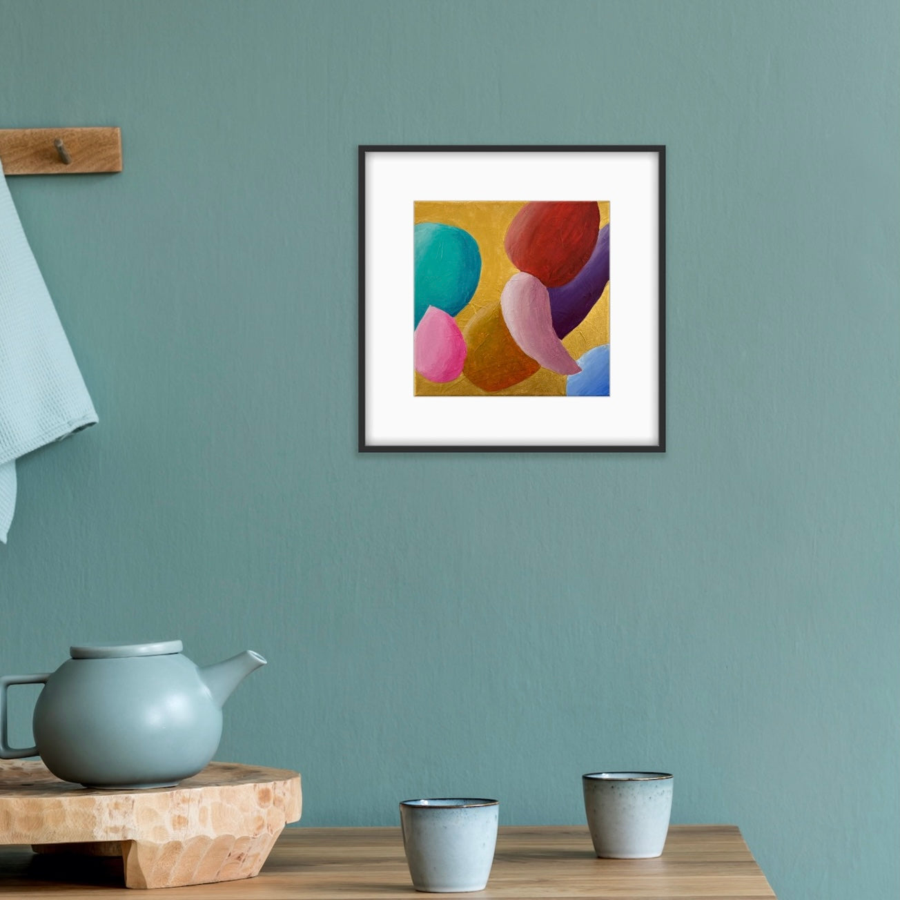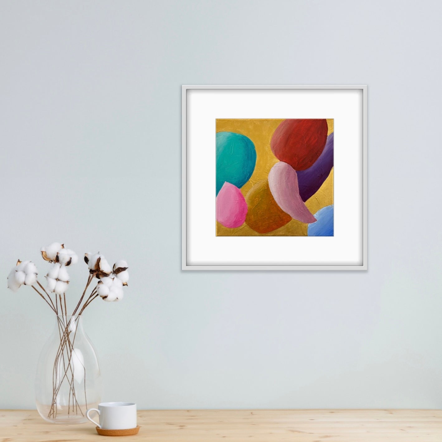 This abstract painting features a small yet intricate design, bursting with vibrant colors that contrast against the luxurious gold background. With crafted details, this piece is sure to add a touch of artistic elegance to any space.