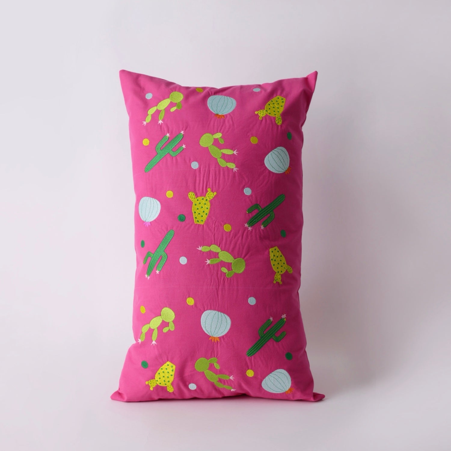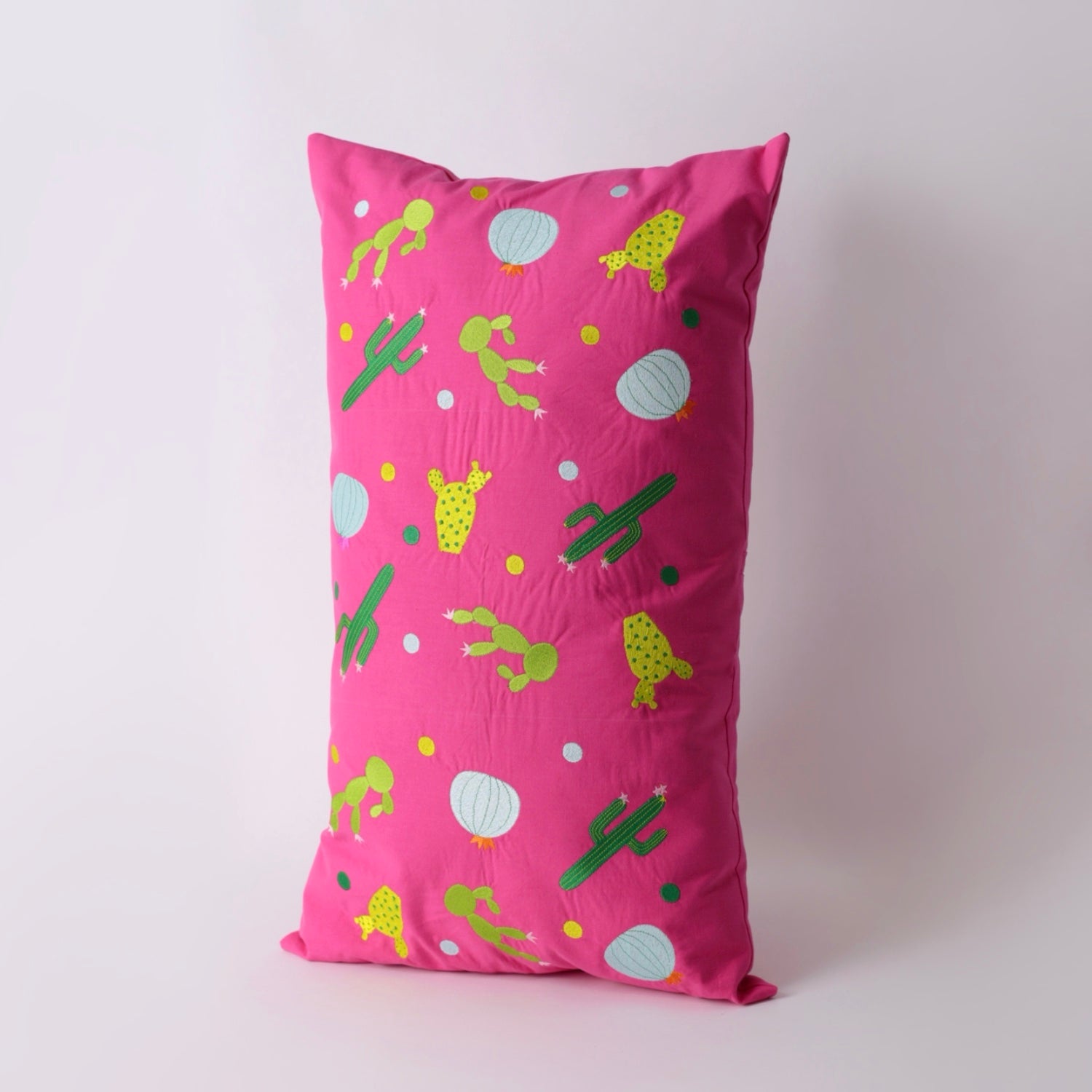 Pink machine embroidered cushion. Embroidery is multicolored with cactus motive.