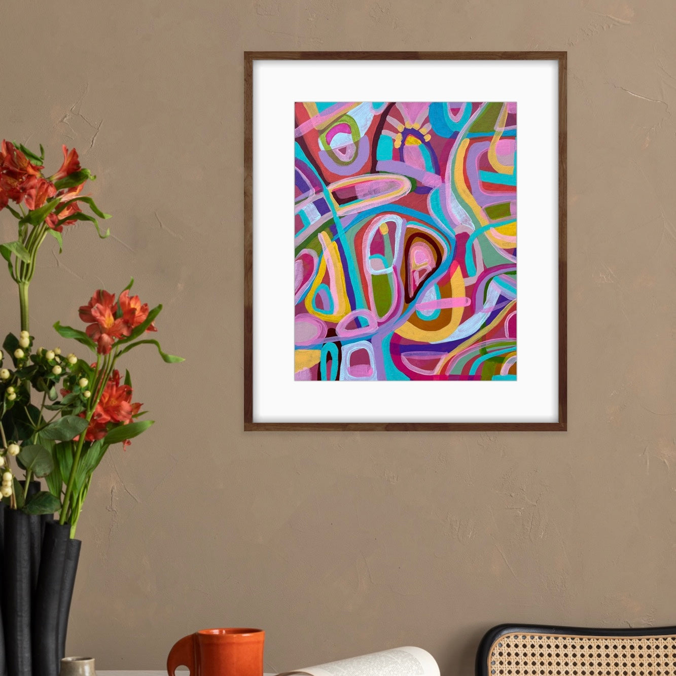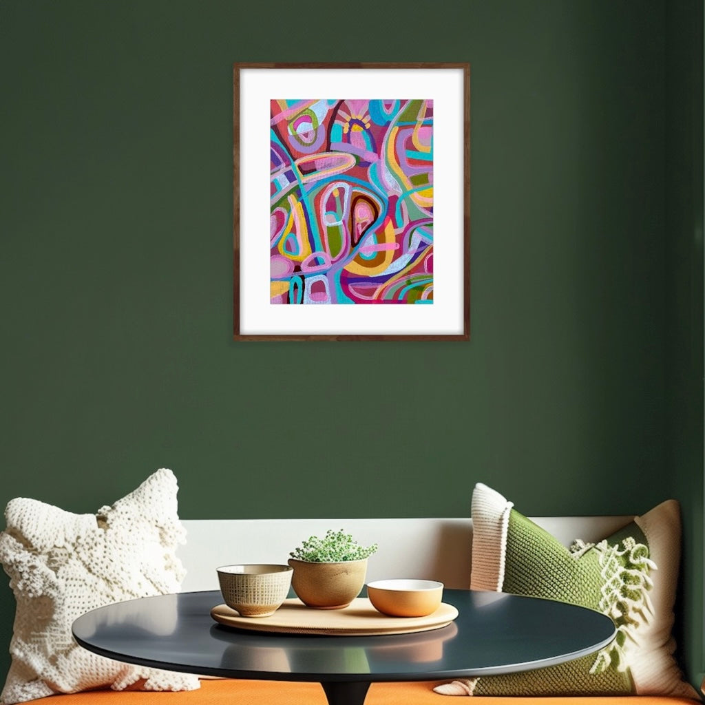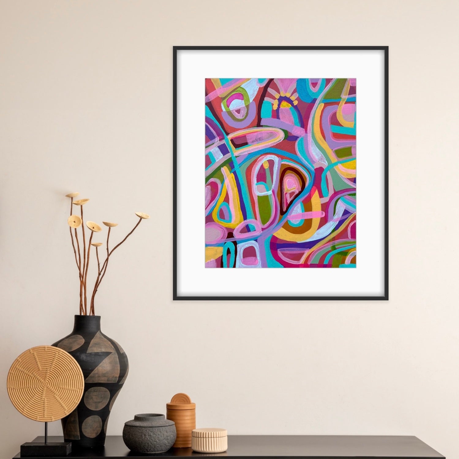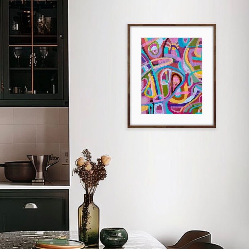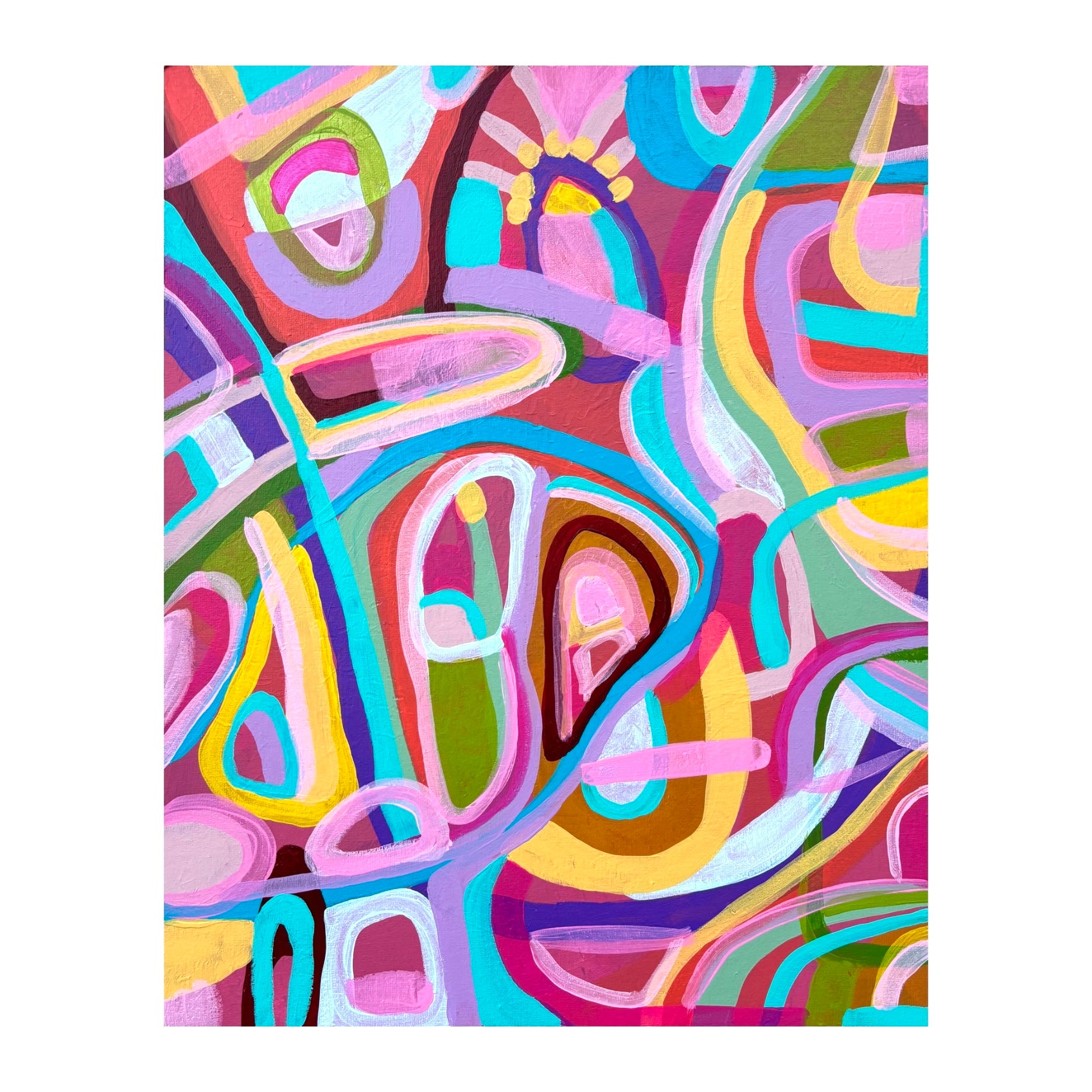 "Somewhere" is an original acrylic painting that combines vibrant colors with an abstract design. This piece invites you to discover what you seek within its rich layers.