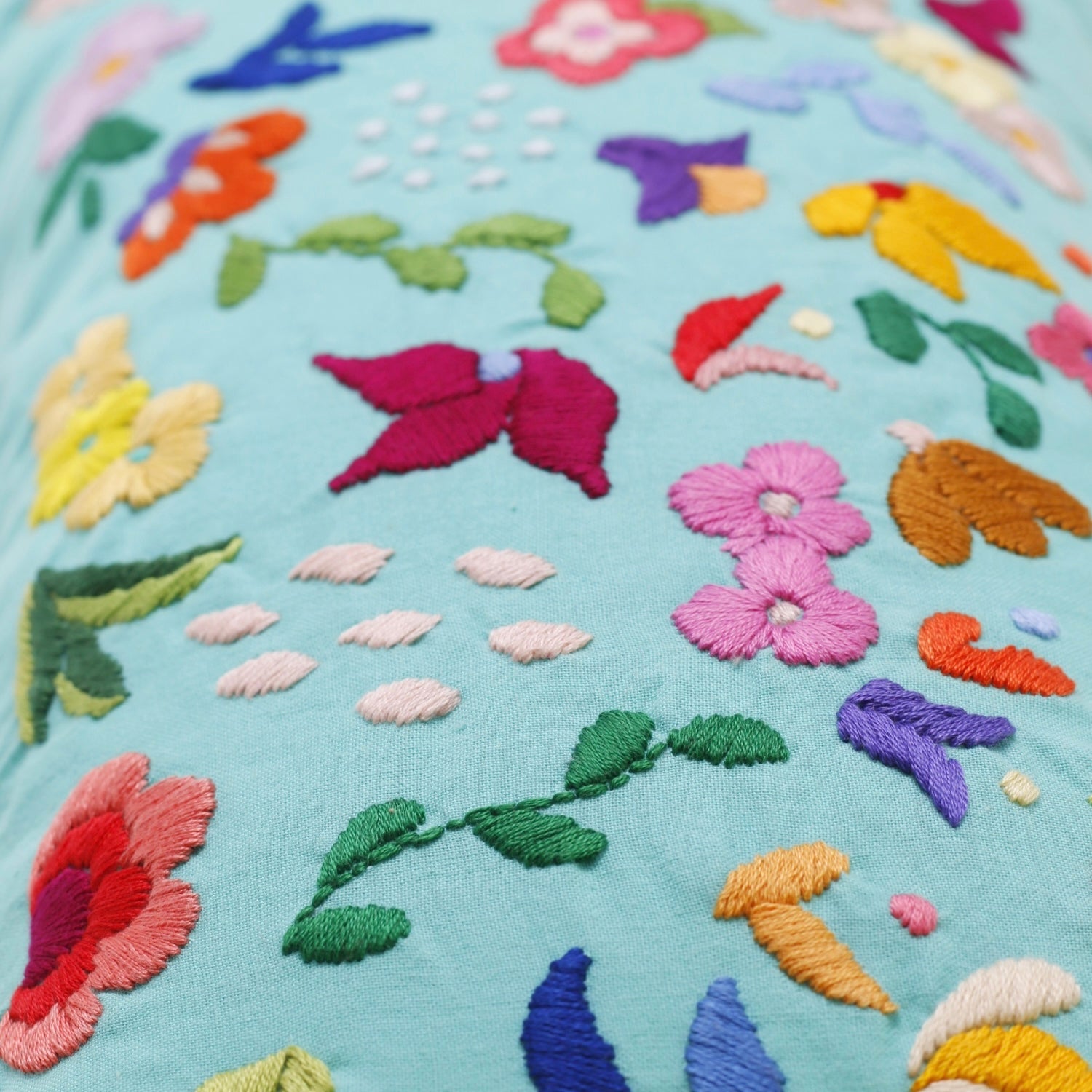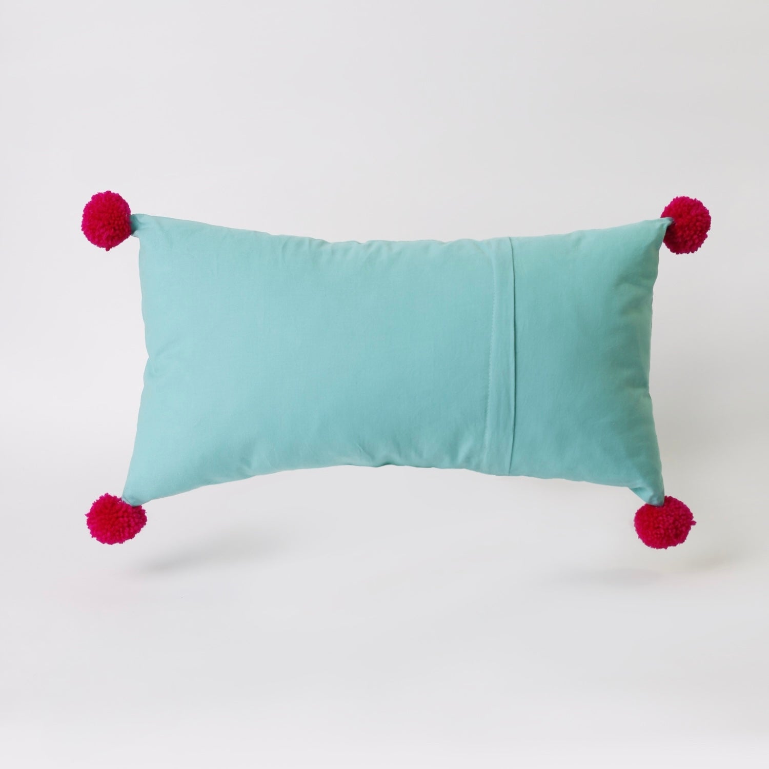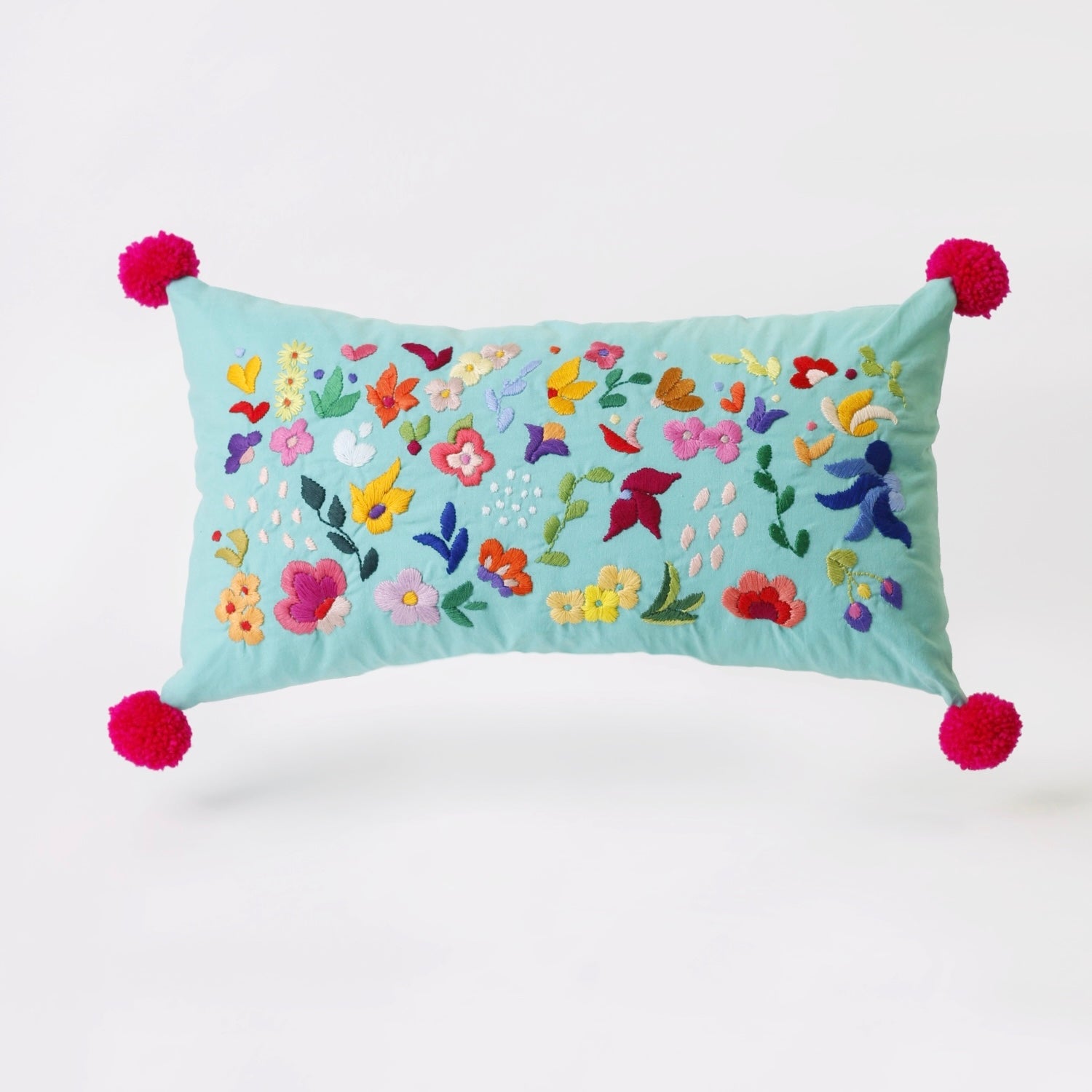 Hand embroidered cushion in beautiful turquoise colour with multicoloured hand embroidery design, with pompons. A stunning addition to bring texture and colour to an accent chair or sofa.