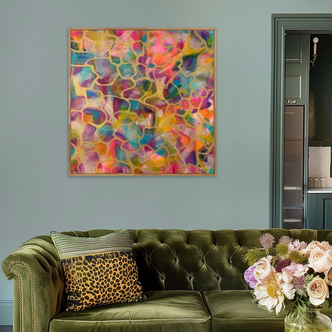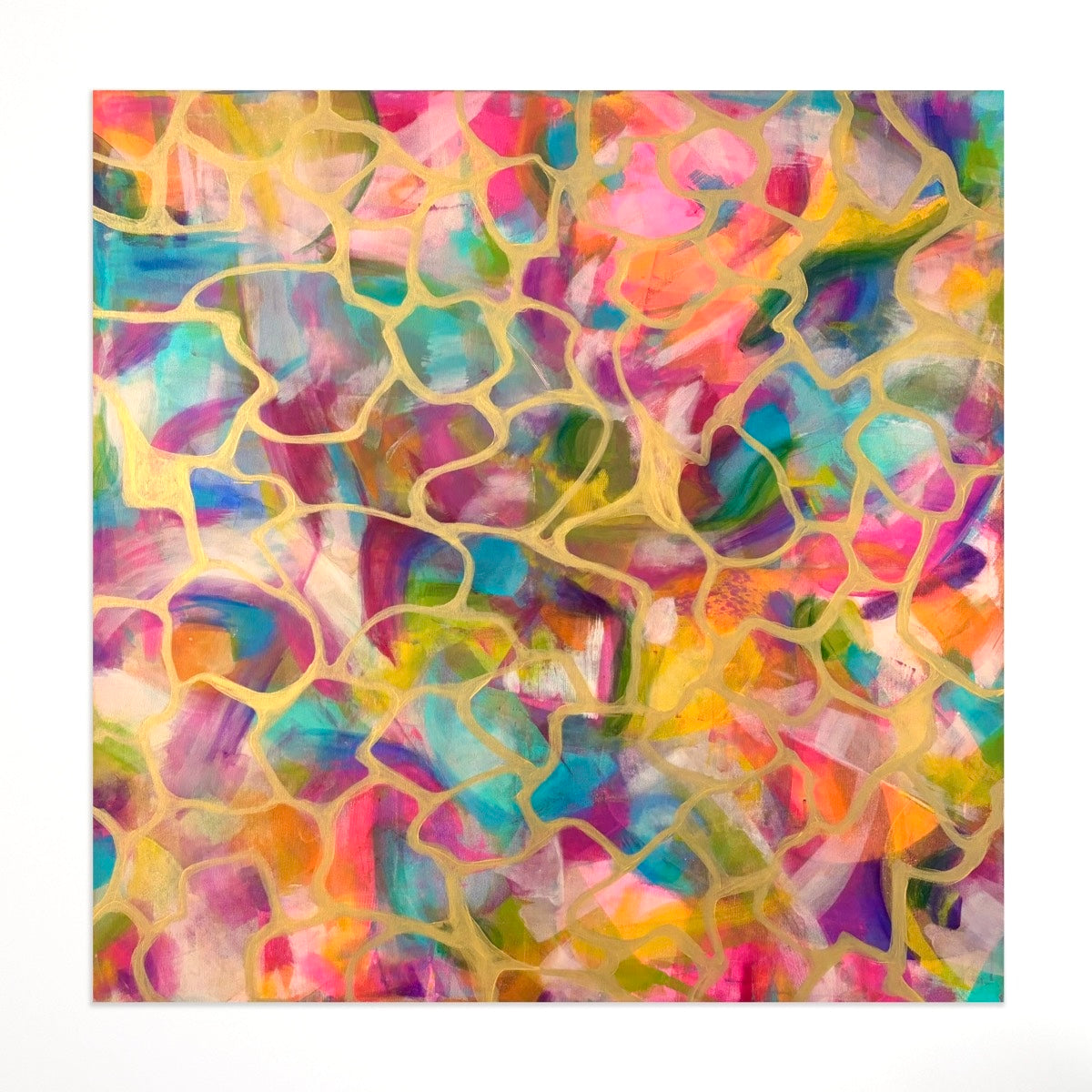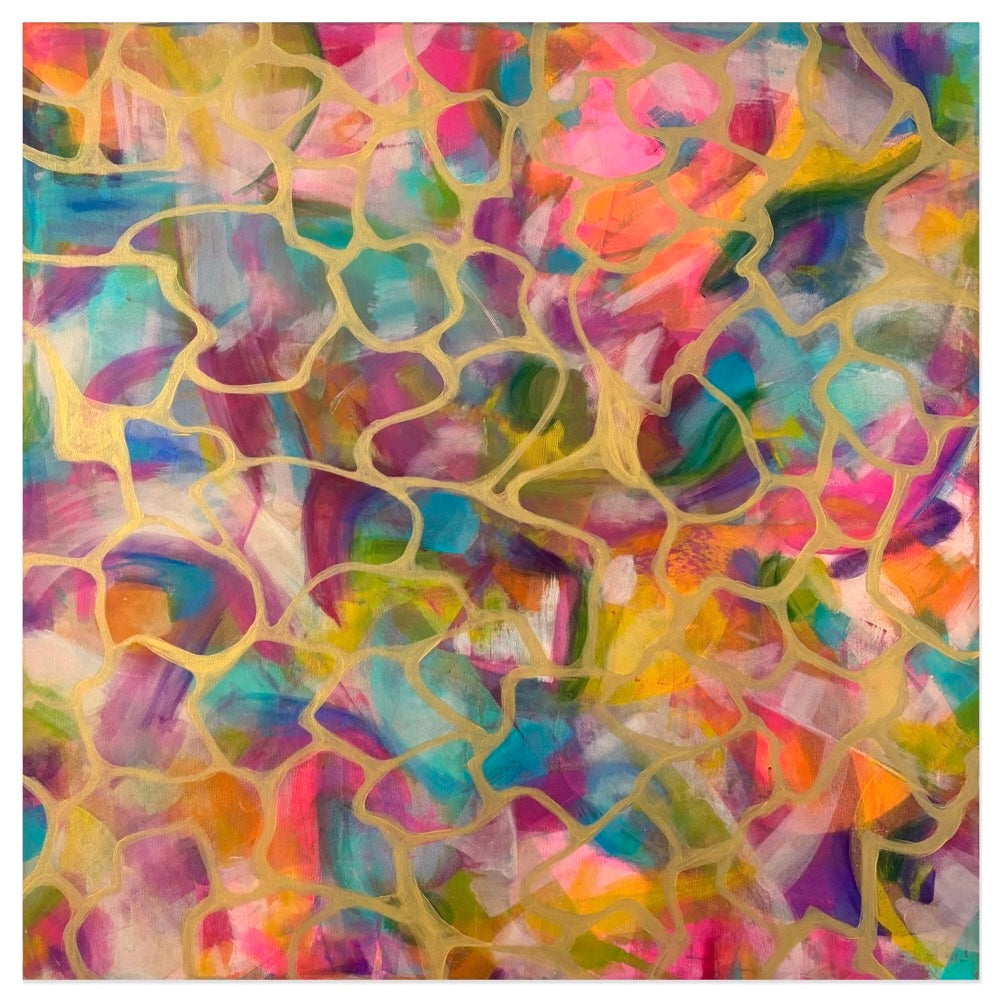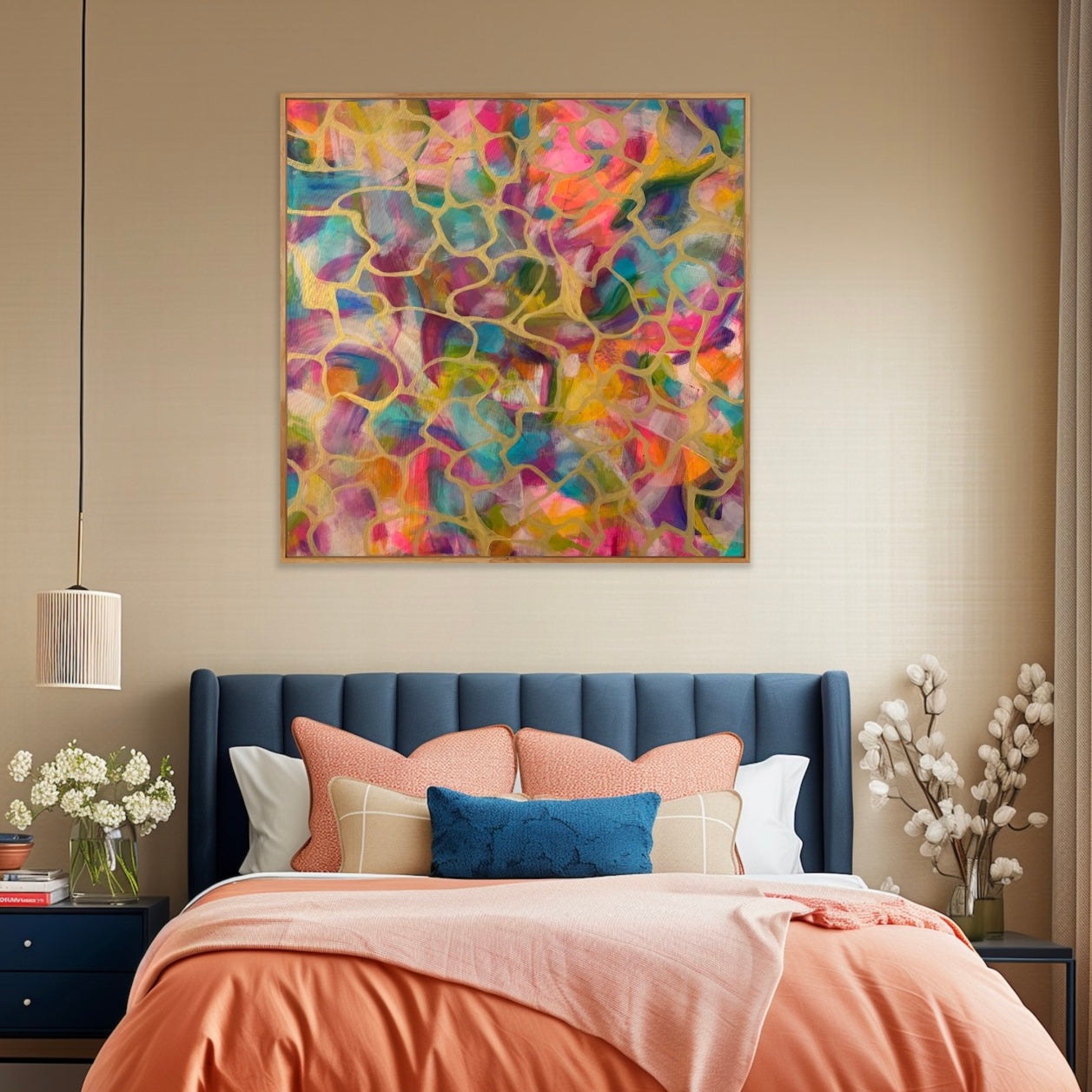 This abstract painting features vibrant colors, accented with a shimmering gold web, evoking a sense of harmony and tranquility. Perfect for adding a touch of elegance to any space, this piece is sure to captivate and calm the viewer. A must-have for any art lover or interior designer.