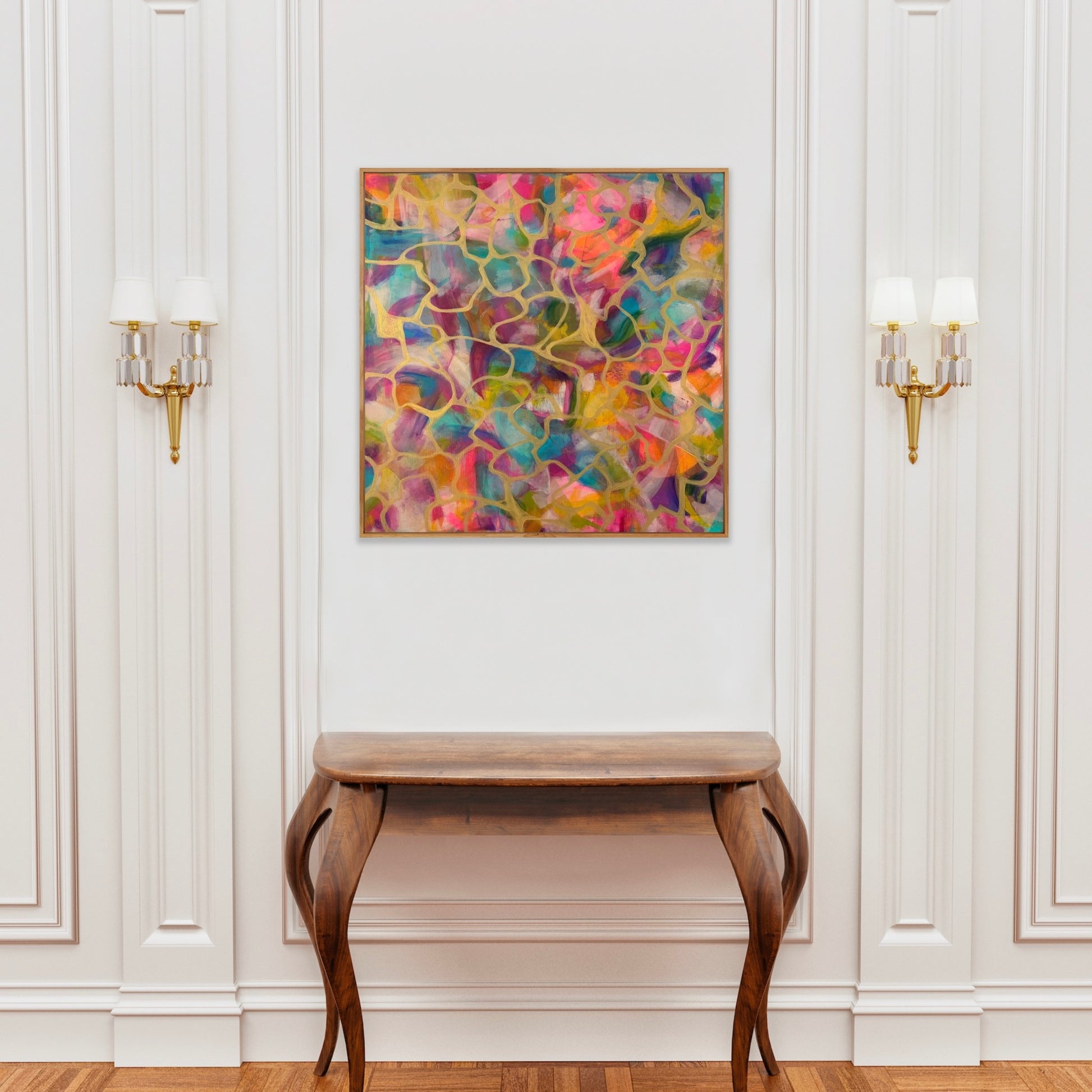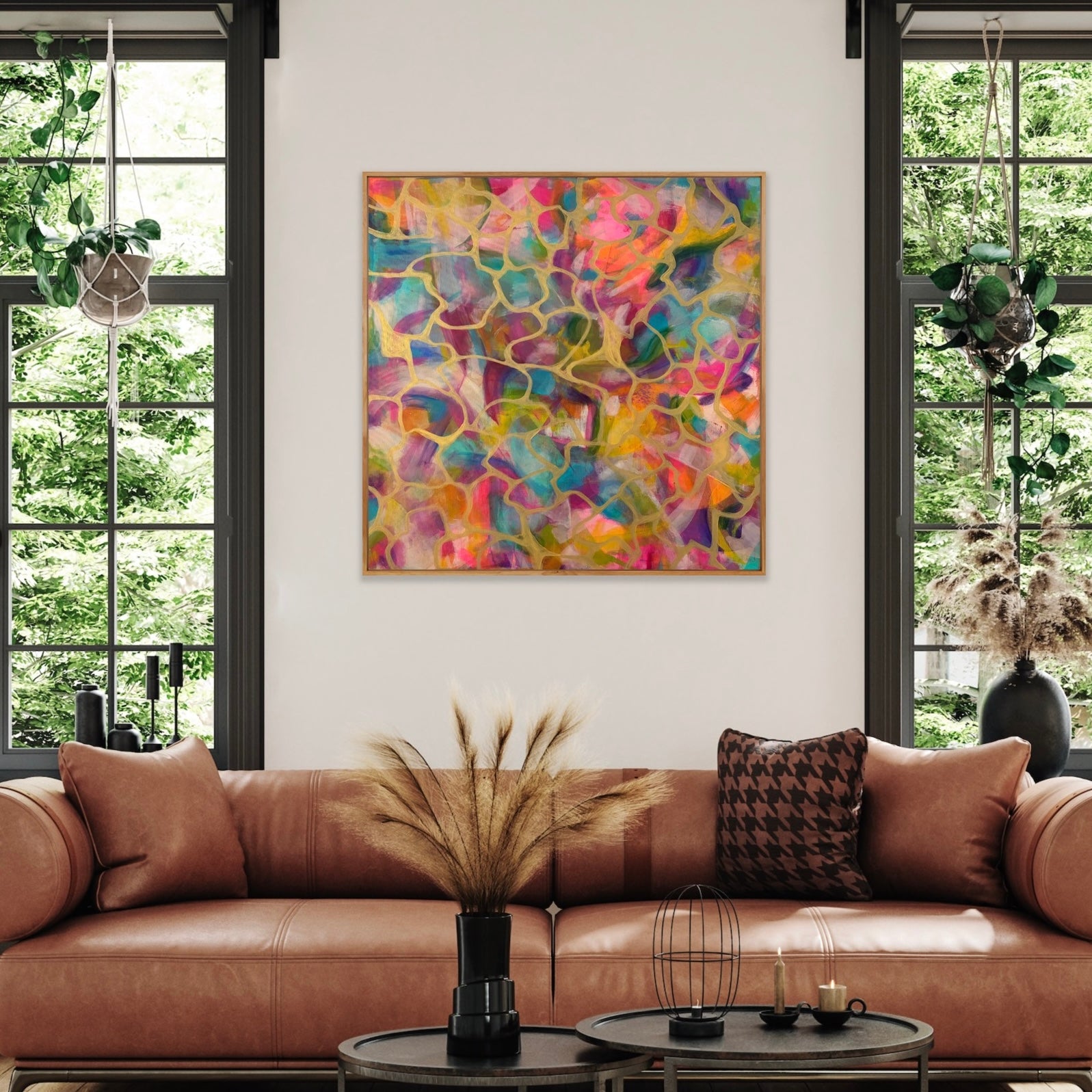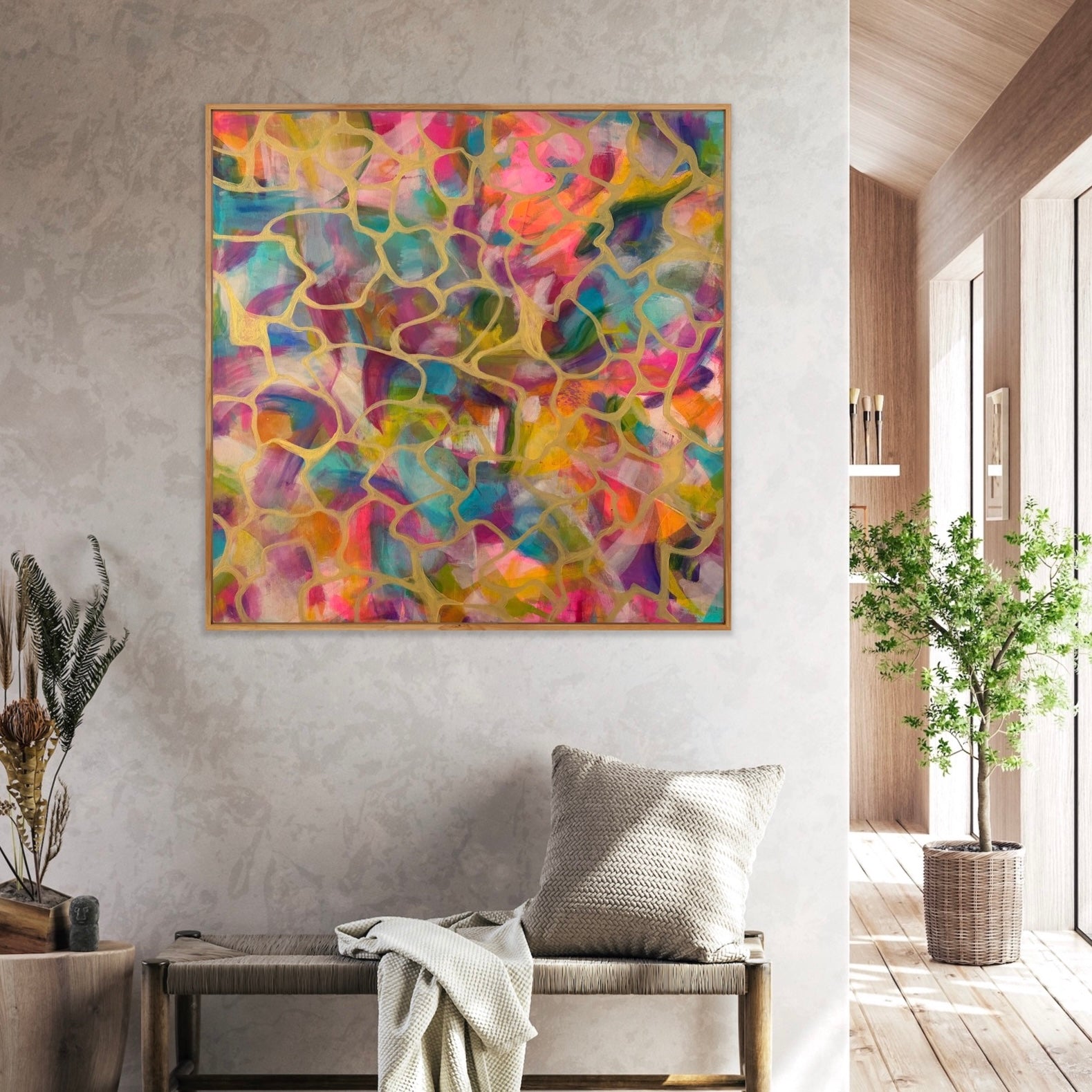 This abstract painting features vibrant colors, accented with a shimmering gold web, evoking a sense of harmony and tranquility. Perfect for adding a touch of elegance to any space, this piece is sure to captivate and calm the viewer. A must-have for any art lover or interior designer.
