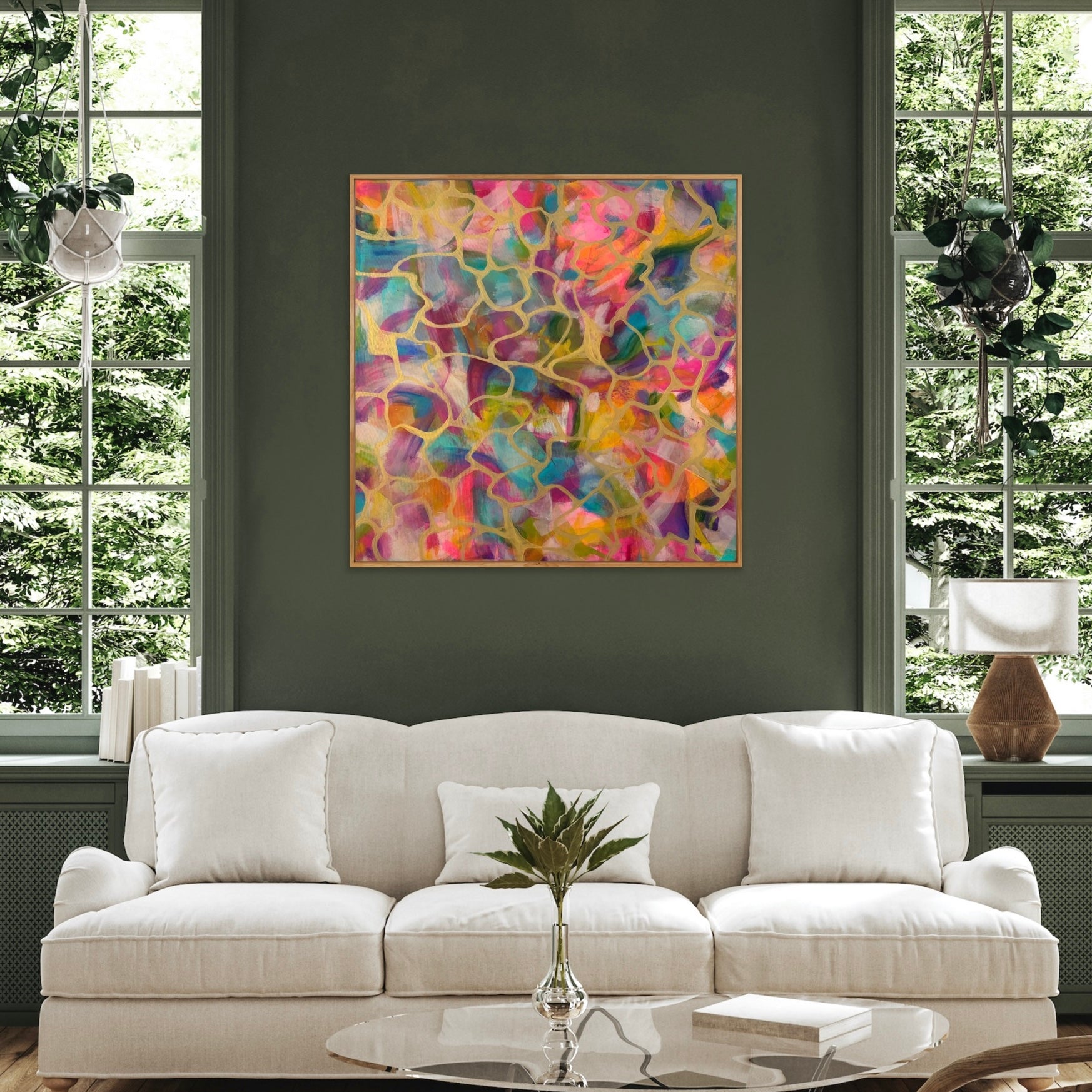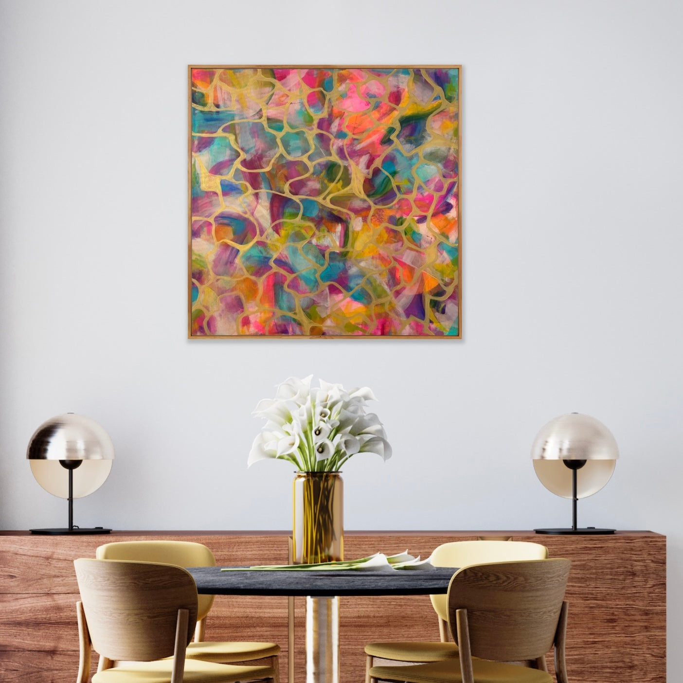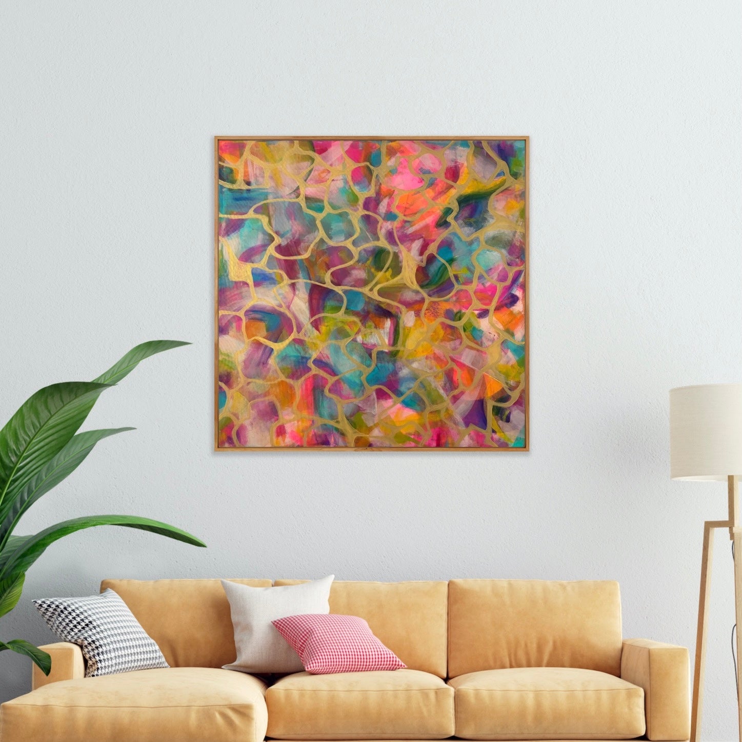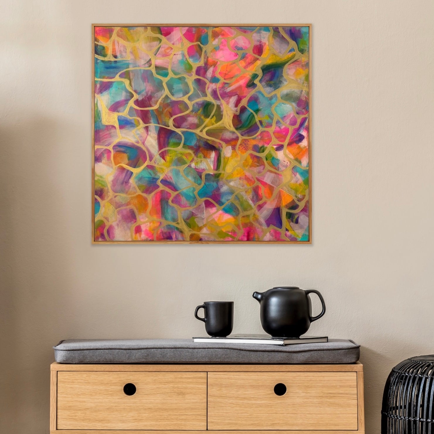 This abstract painting features vibrant colors, accented with a shimmering gold web, evoking a sense of harmony and tranquility. Perfect for adding a touch of elegance to any space, this piece is sure to captivate and calm the viewer. A must-have for any art lover or interior designer.